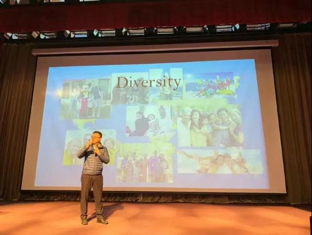 1.2班马牧希同学的爸爸分享了世界各地不同肤色的家庭,还为大家呈现了组成一个家庭的秘诀:爸爸妈妈我爱你。