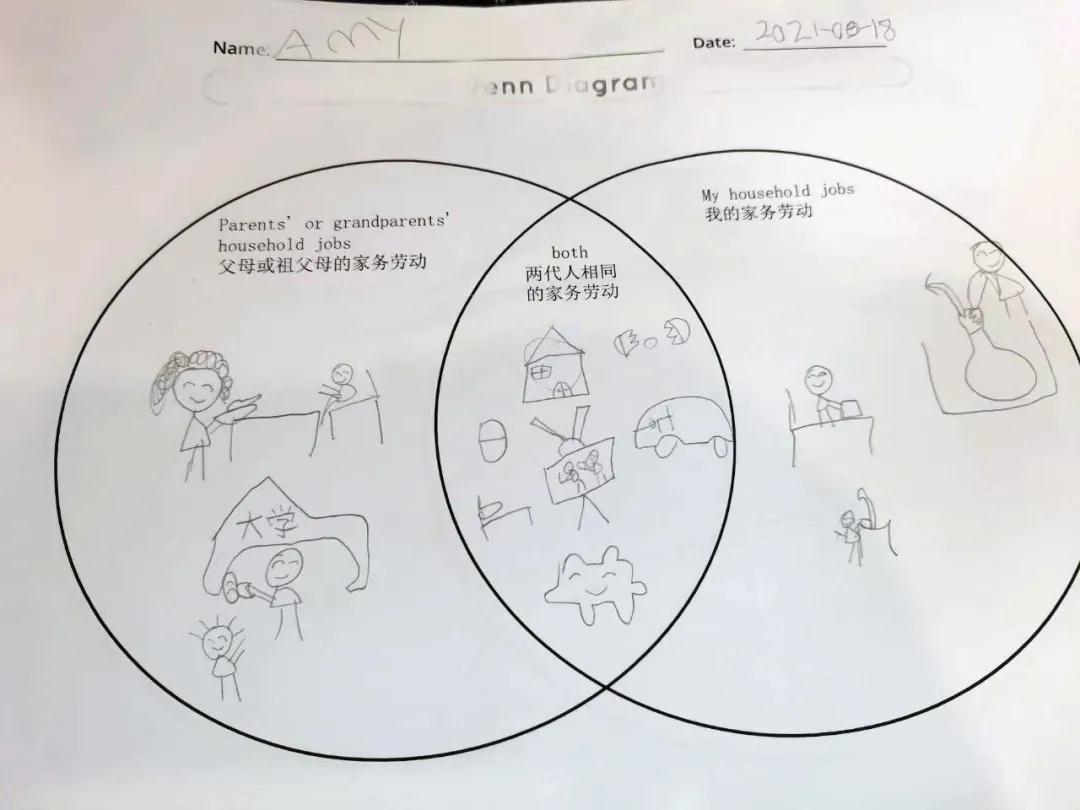分享会之后,孩子们学习通过Venn Diagram图表进行分类、整理,他们学以致用,把爸爸妈妈和他们童年的不同都总结在了图表里。