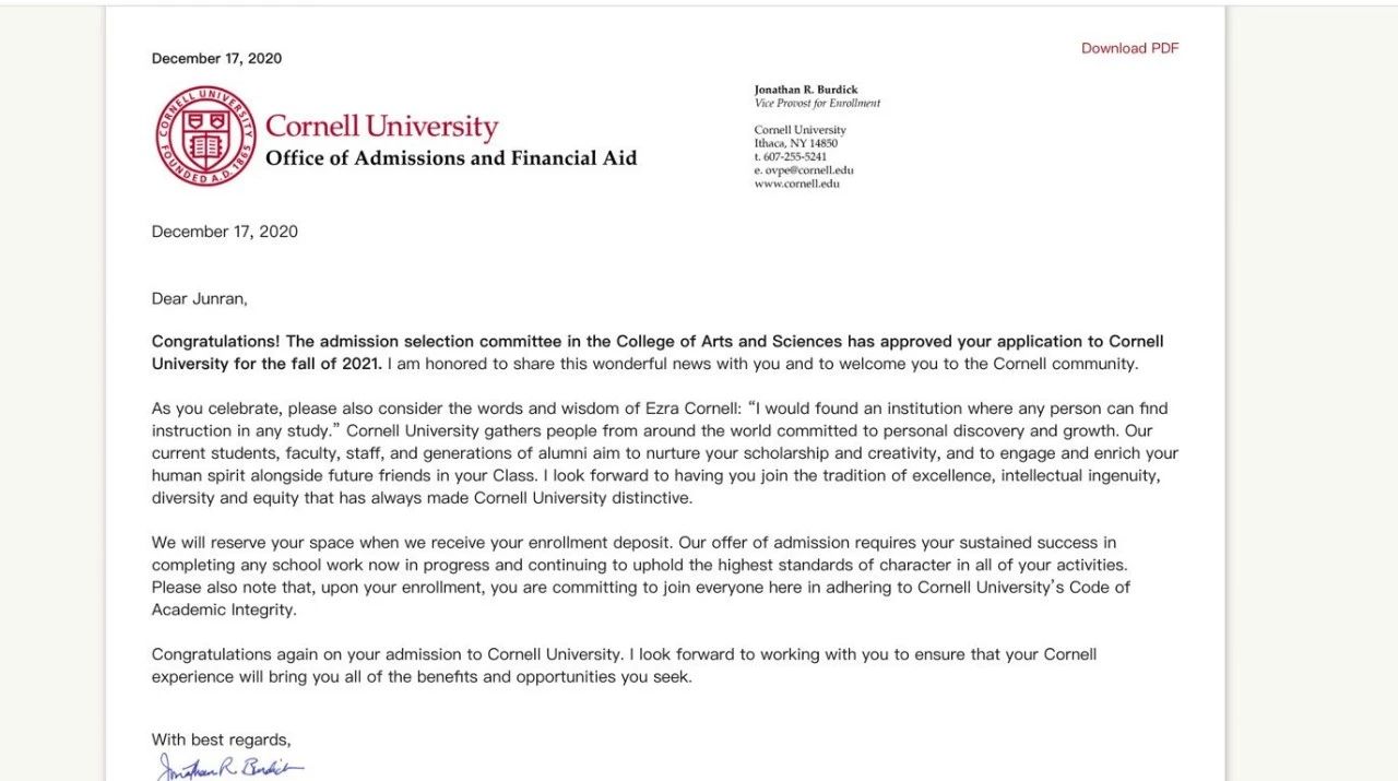 尽管如此,作为康奈尔死忠的她,在offer来的当天早上仍然提前5分钟起了床,坐在电脑前。8点放榜时,君然第一时间就点链接进去,却发现并没有飘彩带。