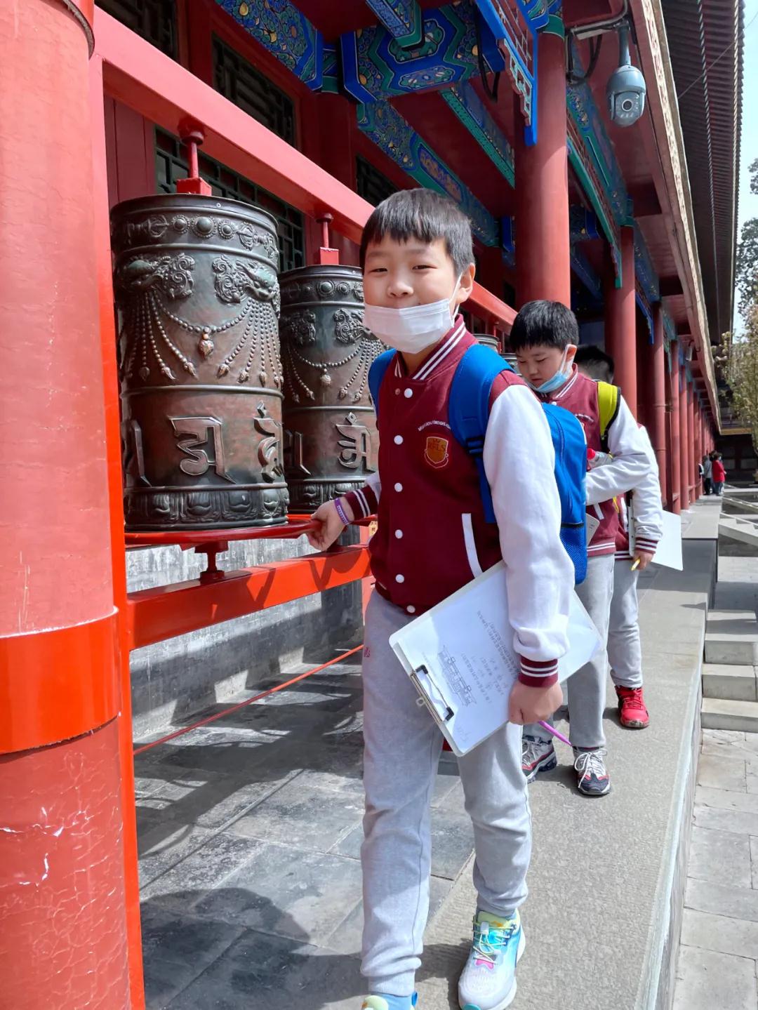 藏传佛教信仰对于清代皇帝尤为重要,作为皇帝宠臣的和珅自然也在家中修建了佛楼。站在这雕栏玉砌的庭院中,回想着老师在课堂上讲过的中国宗教、印度宗教,同学们轻轻转动转经筒,与百年前的历史有了一次擦肩!