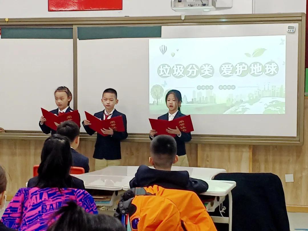 四名“宣传员”刘嘉诚、张博扬、廉赟皓、张嘉敬和同学,分别对“可回收垃圾、有害垃圾、厨余垃圾和其他垃圾”进行了详细的介绍,倡导大家一起行动起来,践行垃圾分类,变废为宝。