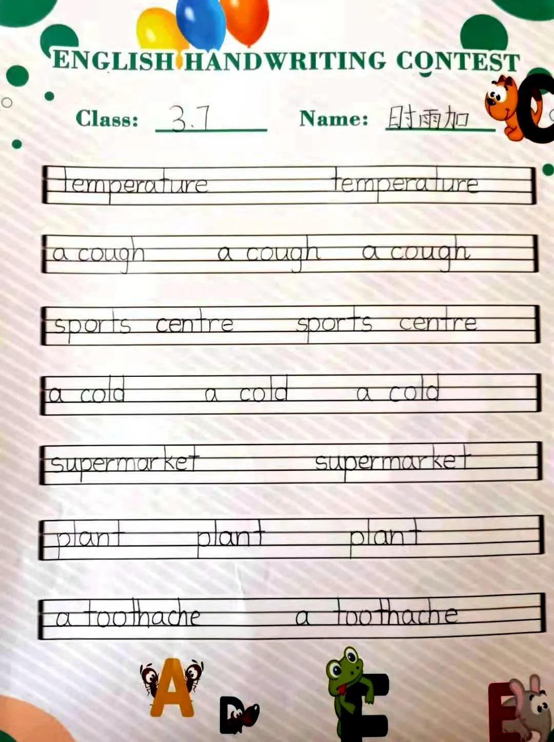 堪比“印刷体”!英文书写也能如此美 进入四月以来,北京王府外国语学校小学部迎来了一年一度的英文书写大赛活动。月初各个班级展开了初赛,在日常细节里培养良好的书写习惯,激发英文学习的热情。 英文书写比赛也是小学部日常写字课的成果展示。写字课上,除了练字,对于书写姿势、书写内容同样有着严格的标准。 比赛中,孩子们一丝不苟,认真书写,充分展现了自己的书写功底。英语老师以投票的形式评选出一、二、三等奖及优秀奖,一幅幅精美的书法作品,展现出孩子们扎实的基本功和认真的态度。 希望王府娃能够再接再厉,坚持优秀的书写习惯! ▲英文书写比赛颁奖仪式 投稿|魏薇 摄影|子婷 编辑|晓婉 2021年4月27日 | 小学资讯