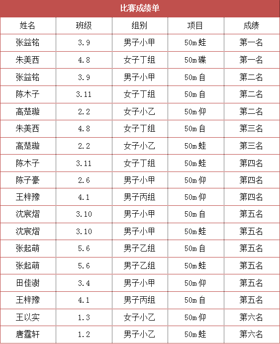 本次比赛,小学部共派出12名队员参赛,涉及一年级至五年级各个年龄阶段的学生。在王妍、张璐、付艳玲、梁然四位游泳教练的带领下,他们积极备战,以昂扬的斗志投入到比赛中去。