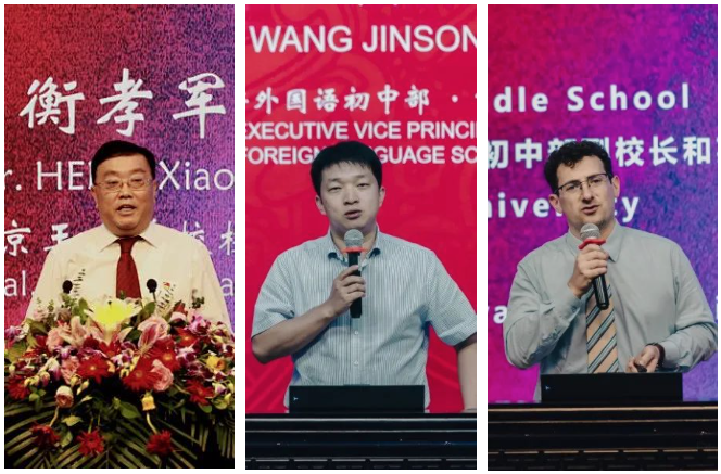 ▲左起北京王府学校校长衡孝军、北京王府外国语初中部常务校长王劲松、北京王府外国语初中部副校长Jonah Carpi