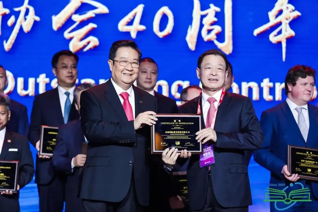 年会表彰了多年来支持教育国际交流与合作事业并做出卓越贡献的机构与企业,中国教育国际交流协会(以下简称“协会”)会长刘利民先生亲自向法政国际教育投资有限公司(以下简称“法政国际教育”)颁发“中国教育国际交流协会40周年卓越企业合作伙伴”纪念奖牌,法政国际教育创始人王广发先生受邀领奖并合影留念。