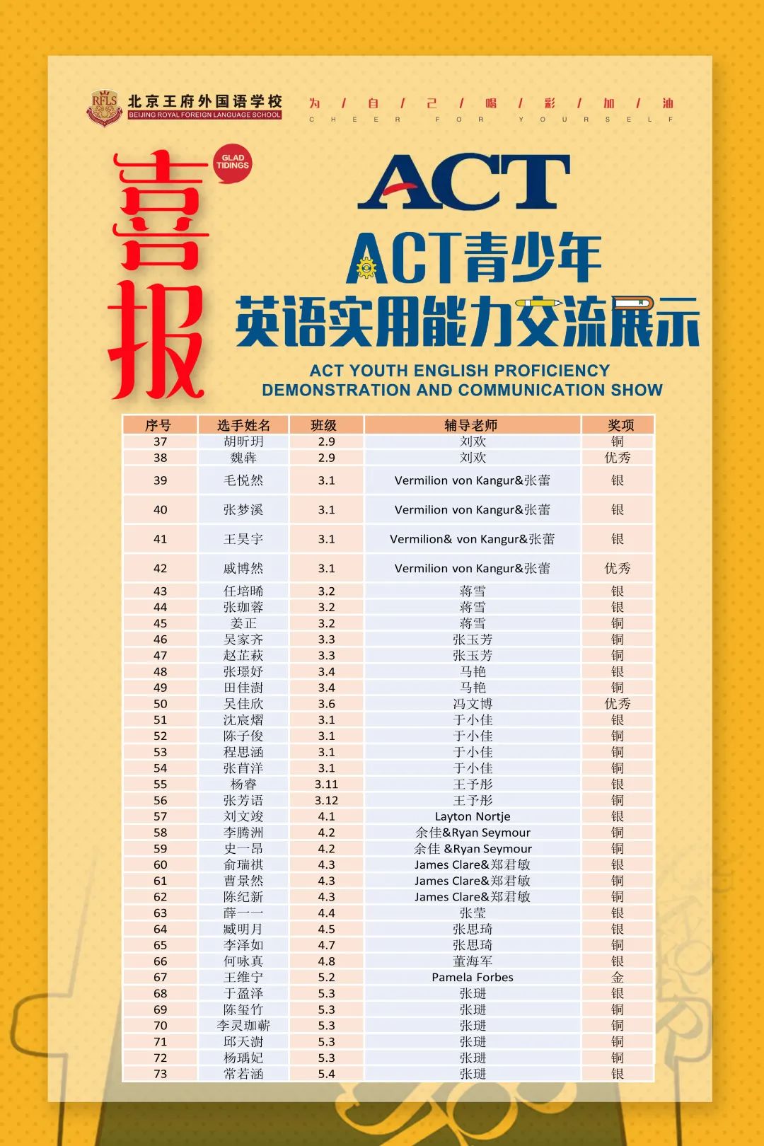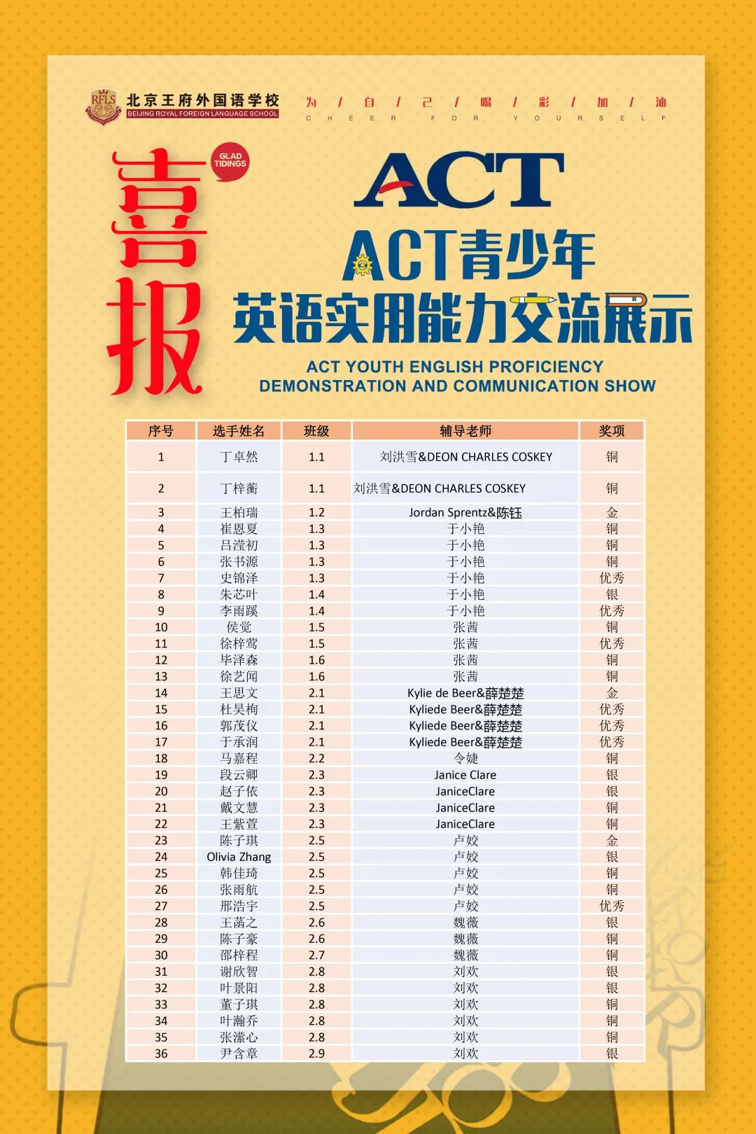 2021年夏天,历经初赛、复赛的激烈角逐,北京王府外国语小学部学子在2021“ACT青少年英语实用能力交流展示-口语类”比赛中,以突出的英文运用能力,共摘取了4金、23银、36铜以及10个优秀奖,共73枚奖牌的优异成绩。