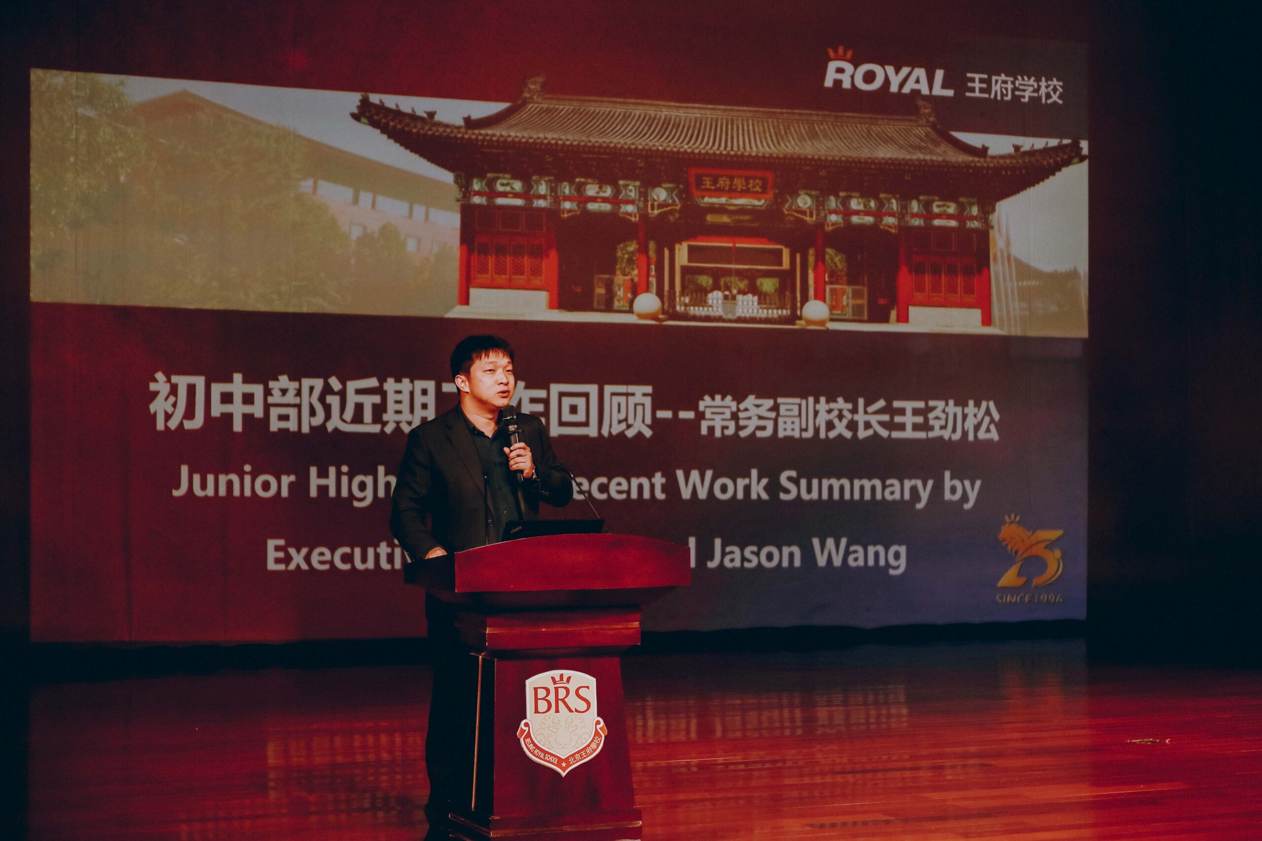 大会伊始,北京王府外国语学校常务副校长王劲松就初中部九月份的工作及各项活动进行了分享和总结,并简单预告了十月份即将开展的活动。