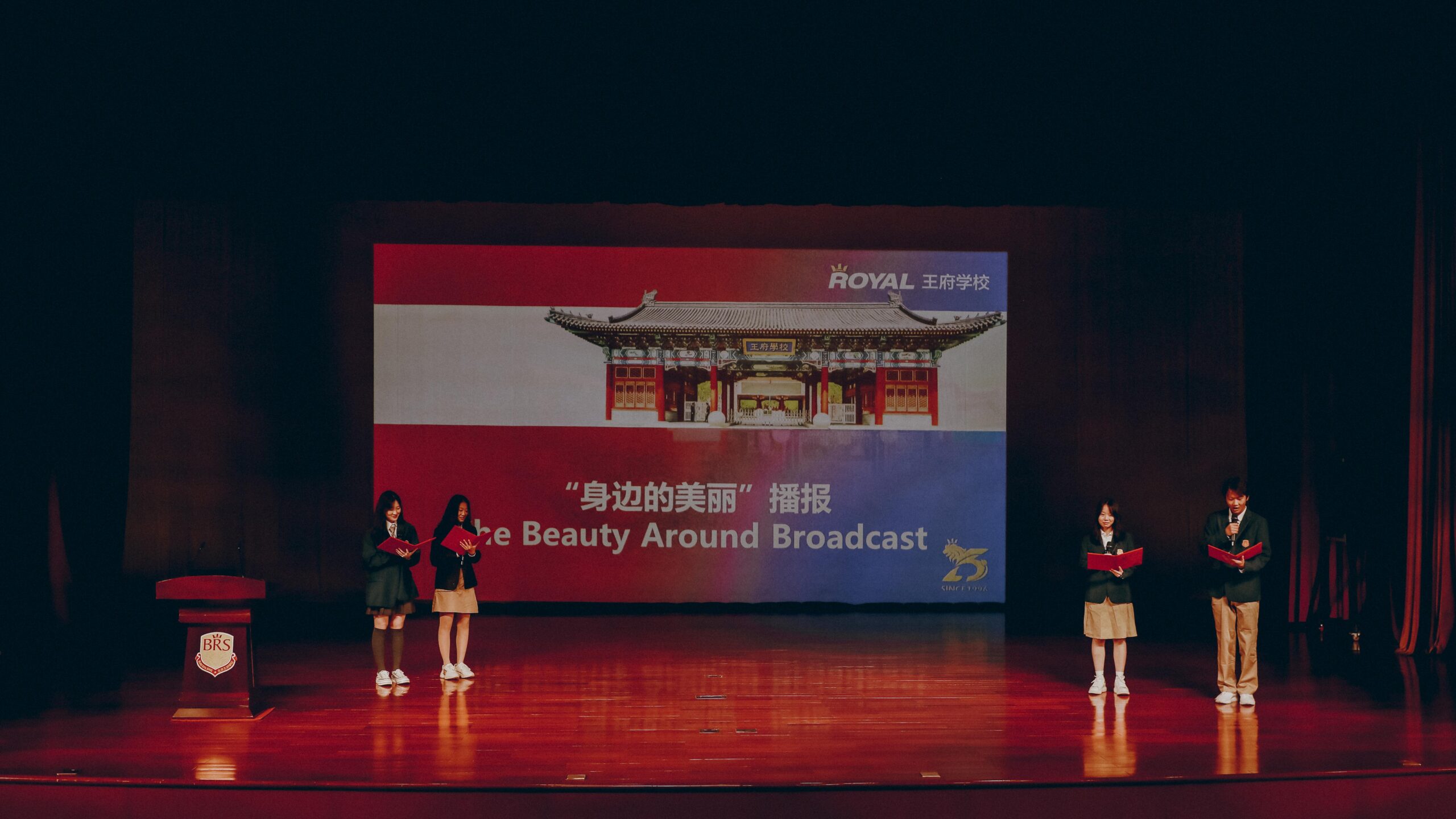 劲松副校长的精彩分享之后,初中部小记者团的四位学生代表上台为全体师生做“身边的美丽”活动部分成果展示。