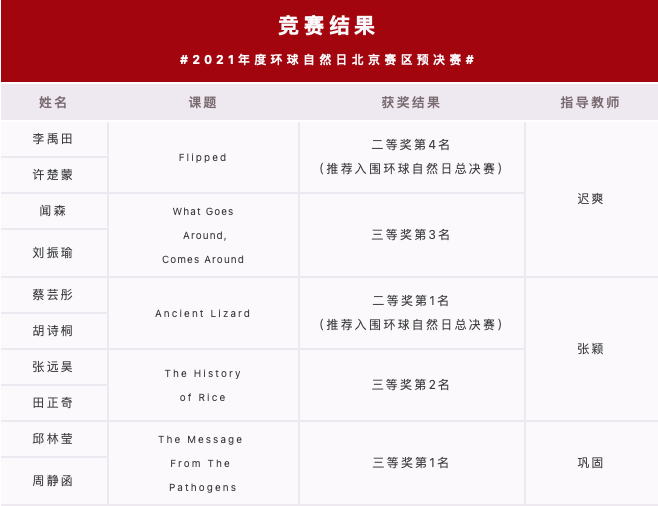 6月19日-20日,2021年度环球自然日北京赛区预决赛展览活动圆满结束,我校初中部共有5组学生(10人)参与展览活动(英文组),在张颖、迟爽和巩固老师的悉心指导下,5组同学均在该轮比赛中斩获佳绩!