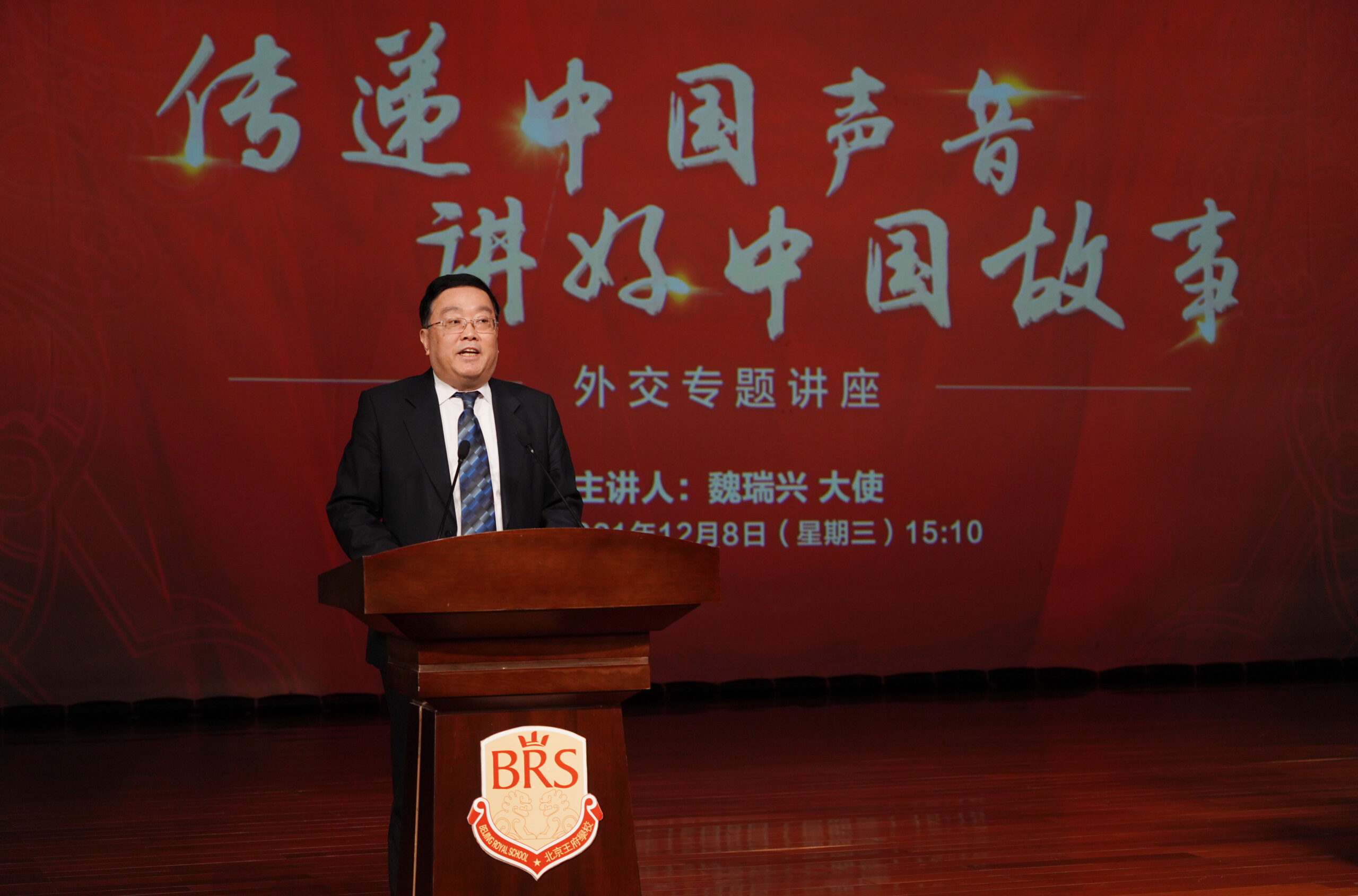 12月8日,资深外交官魏瑞兴大使来到北京王府学校开展“传递中国声音,讲好中国故事”专题讲座,与同学们分享了多年外交生涯的切身体会,并针对同学们感兴趣的外交方面问题,一一解答。成都王府校区、运城王府校区、大连嘉汇校区的同学们也通过线上观看了此次讲座。