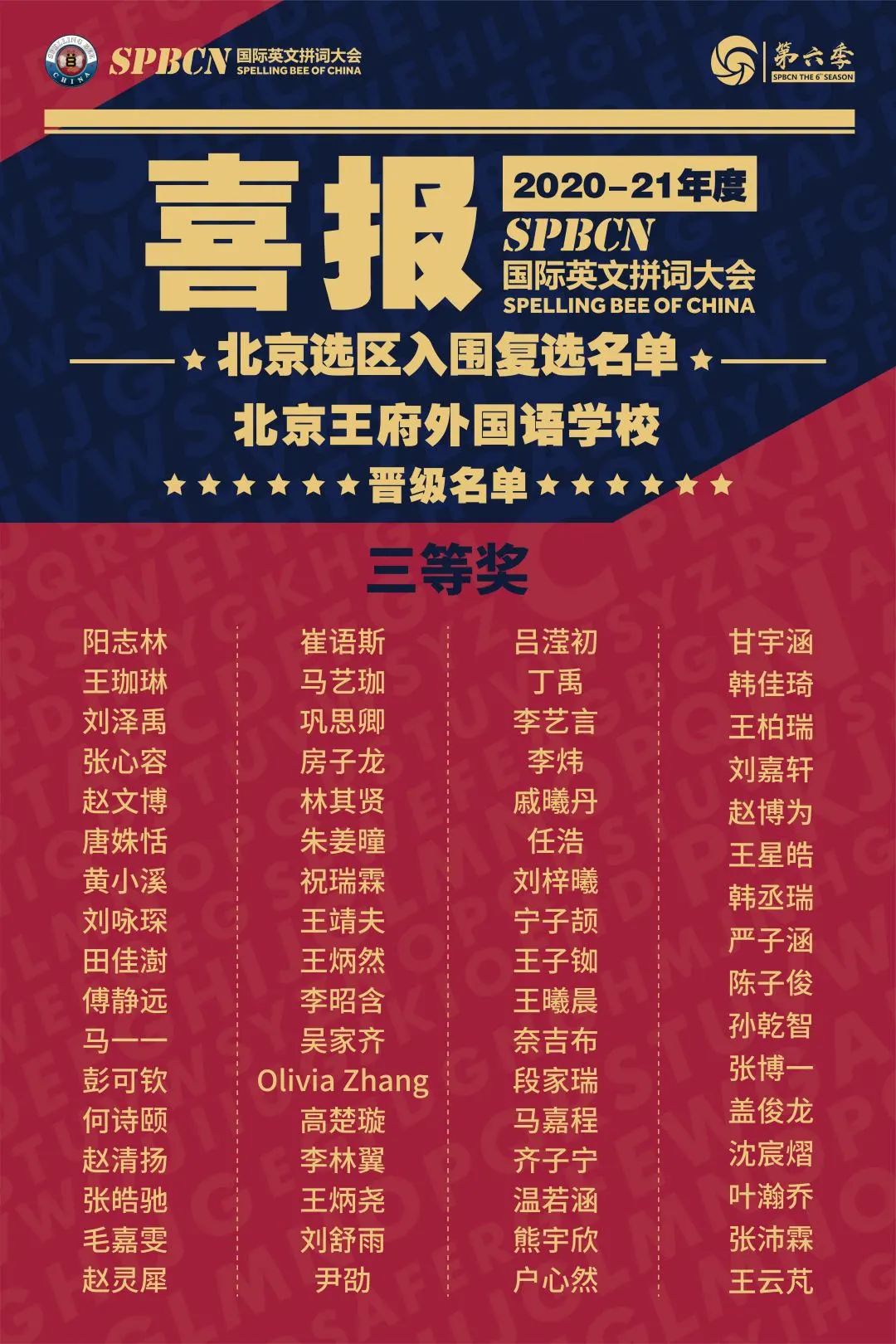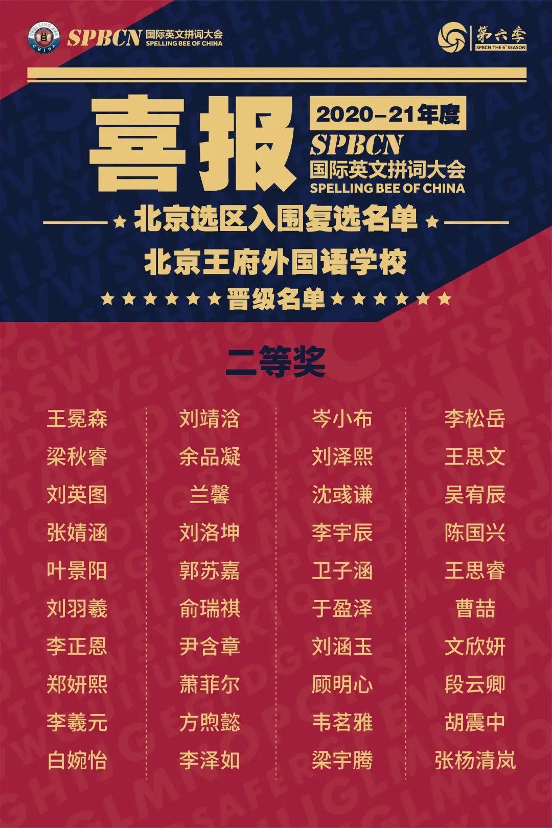 在2020-2021年度SPBCN国际英文拼词大会上,经过历时近一年的初选、复选、北京半决选、北京总决选的激烈角逐和顽强比拼,最终184名王府speller在选拔中荣获佳绩。