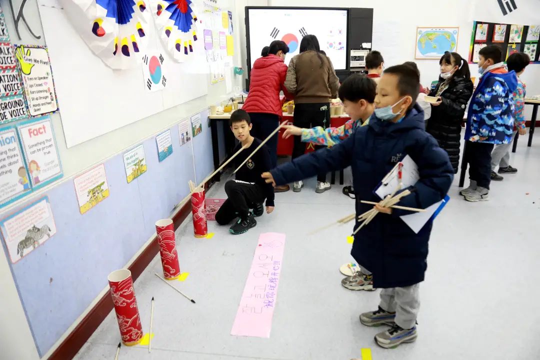 5.1班老师装扮上了传统的韩国服饰,在教室里摆上了电磁锅,为“游客们”制作了美味的韩国炒年糕。