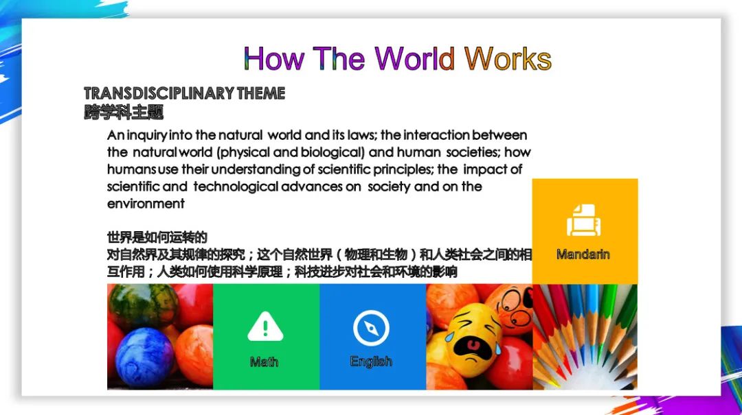 小学双语部UOI课程的设置,是以六大超学科主题为框架,涵盖六门学科,包含五大发展要素。这六个主题突破了传统学科之间的界限,涵盖语言、人文、个人/社会、数学、艺术和科学技术。学生在探究学习的过程中,形成对重要概念的理解,掌握基本知识和技能,形成积极的态度,学会采取负责的行动。