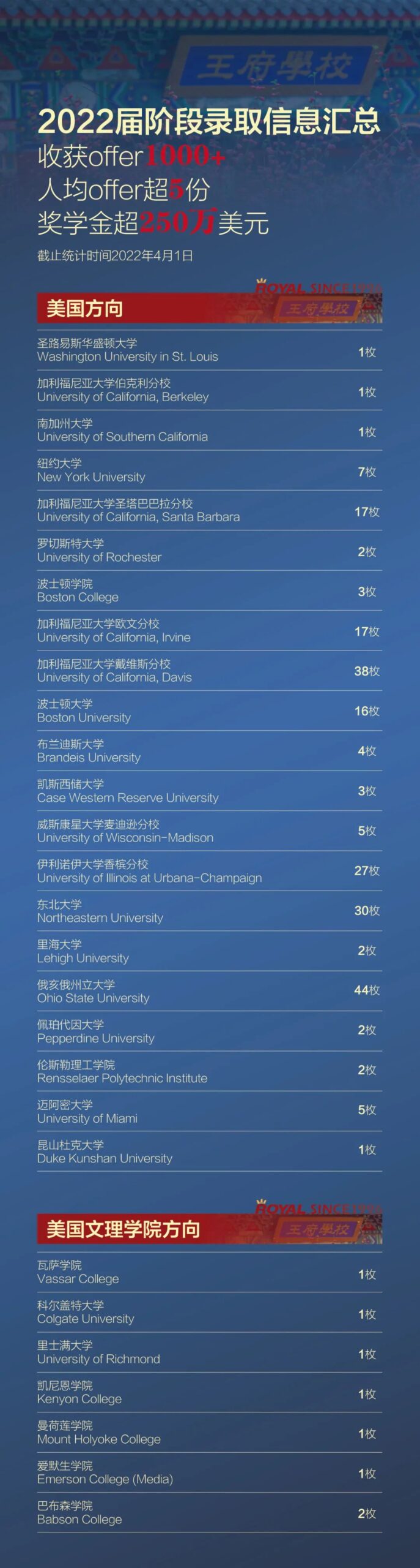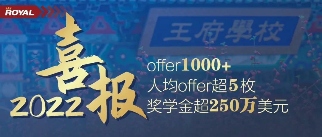 昨日鸿雁降瑞,今日喜报盈门!在2022艰难的申请季,逆势而上的王府学子用硬核实力和坚韧执着再次谱写了属于自己的绚丽华章!按截止4月1日统计,王府学子已成功收获来自美英加澳法等多国方向的录取1000多枚,人均收获offer超5枚,斩获奖学金250余万美元。