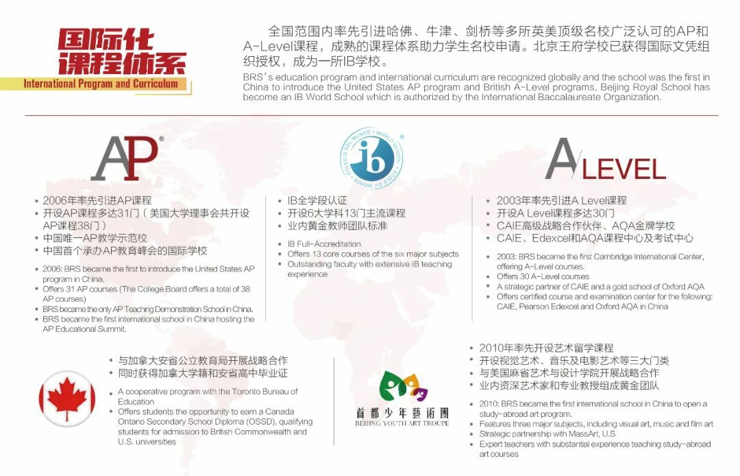 北京王府学校搭建了完备的课程体系,学校已开设AP、A-Level、IB、OSSD项目、艺术留学特色课程等,包括31门AP课程、30门A-Level课程、13门主流IB课程,为无数学子提供了丰富的课程选择。