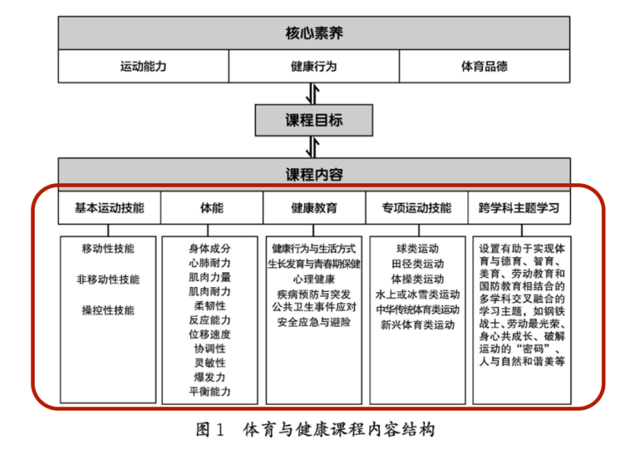 时隔十年的重大专业修订,针对“体育与健康”学科的改革,体现出国家对青少年体育发展的高度重视。新课标的规划中,体育课程内容结构以核心素养为导向,并在课程内容的领域上不断拓宽。