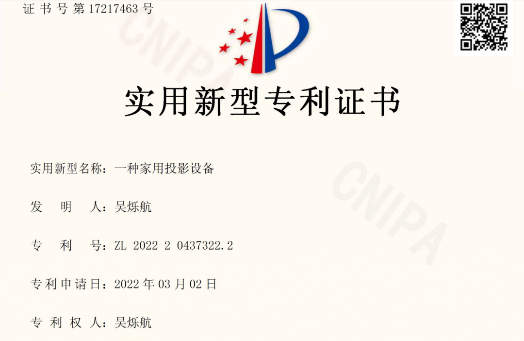 经过几个月的反复设计,他最终通过加装一个支架,实现了从各个角度快速调整。他的“一种家用投影仪设备”也于2022年通过了专利申请。