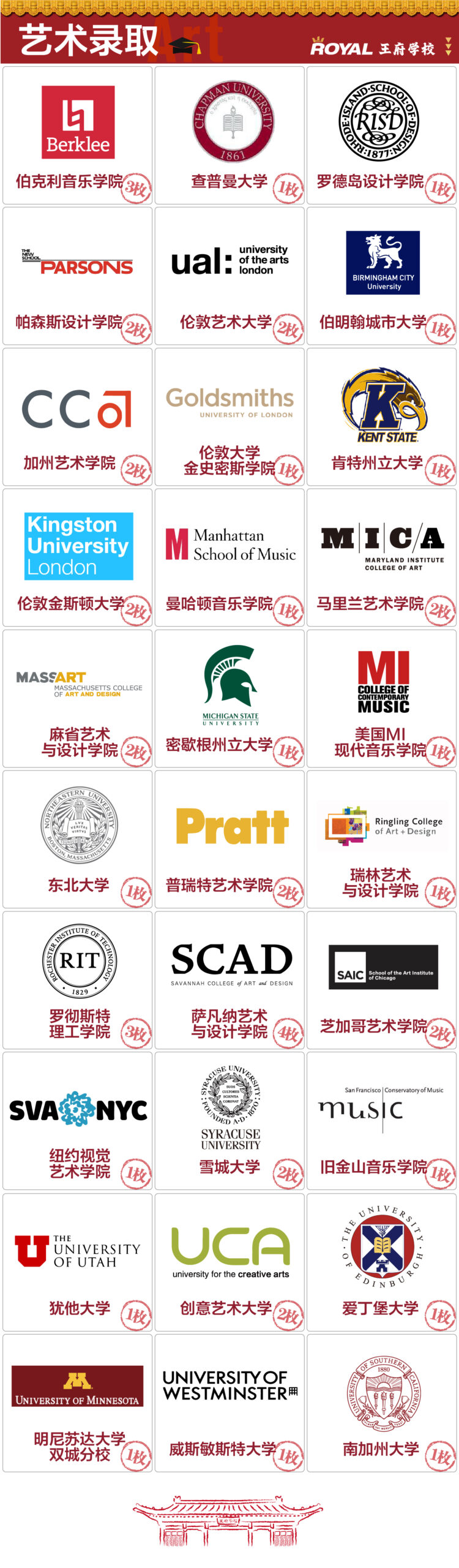 艺术方向再次实现大满贯不仅收获罗德岛设计学院、伯克利音乐学院、帕森斯设计学院以及“好莱坞的敲门砖”查普曼大学、“计算机图形圣地”犹他大学等顶尖名校的录取更有多枚王牌专业和一流综合类大学的突破性录取