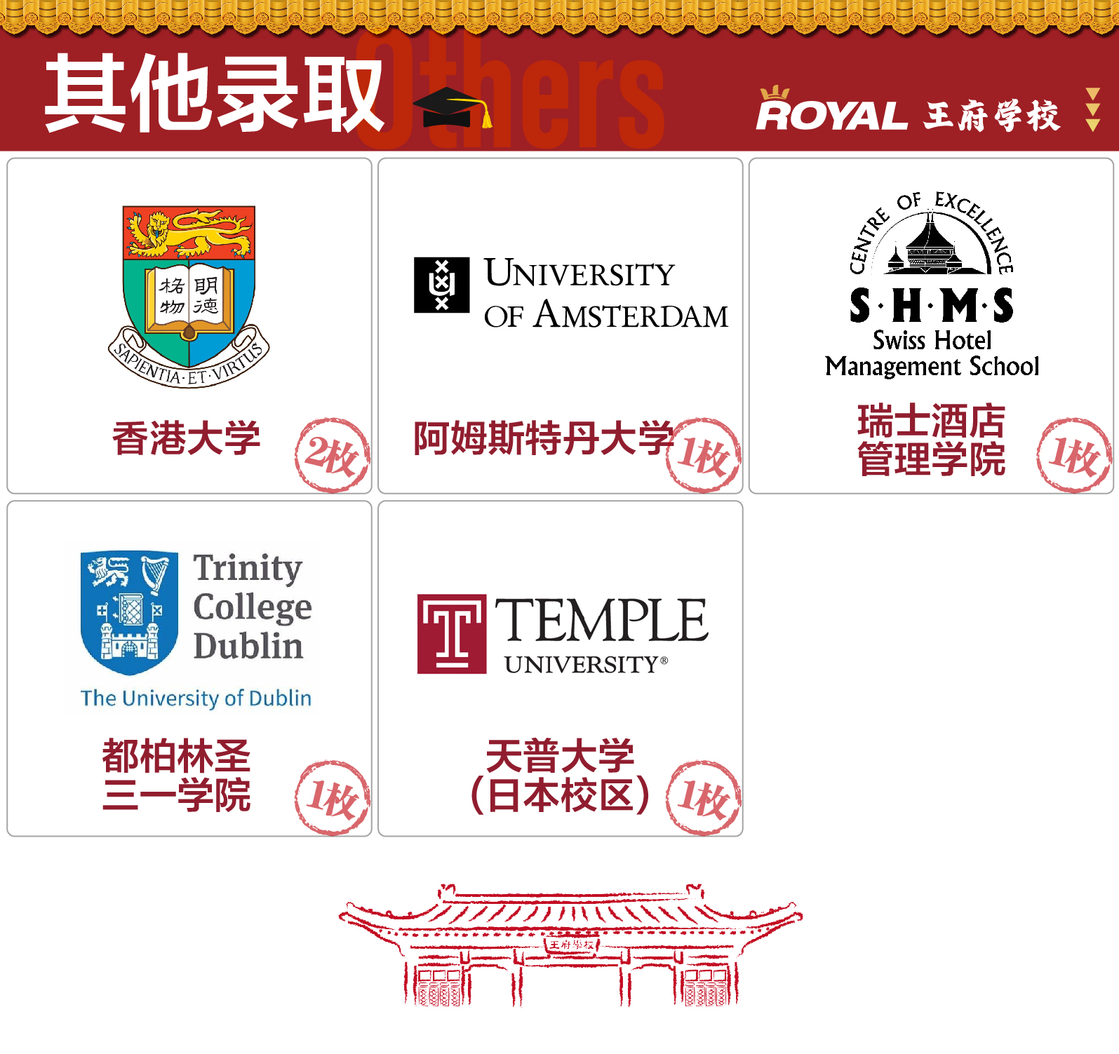 今年王府在早申阶段顺利爬藤,收获了康奈尔大学的录取。在延续往年成绩的基础上,各个方向继续传承优势,圣路易斯华盛顿大学、帝国理工学院、伦敦大学学院、香港大学、麦吉尔大学等录取稳定保持在以往水平。值得一提的是,今年王府其他校区也是喜讯不断——王府大连校区国际部获得剑桥面邀,录取帝国理工学院、伦敦大学学院、加利福尼亚大学圣巴巴拉分校、麦吉尔大学、墨尔本大学、香港大学等世界名校……除常规英美加澳等留学方向,今年还有同学获得欧洲及中东地区等大学的录取,遍布世界各地。