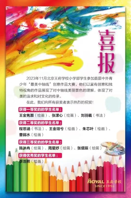 春雷起,万物生。伴随着春风的脚步,首届中外青少年“最美中轴线”创意作品大赛、美术等级考试……一封封喜报纷至沓来,成为王府少年成长路上最美的注脚。
