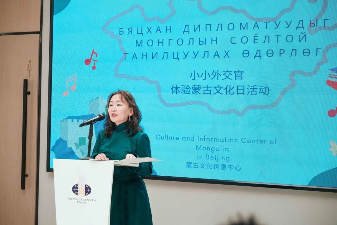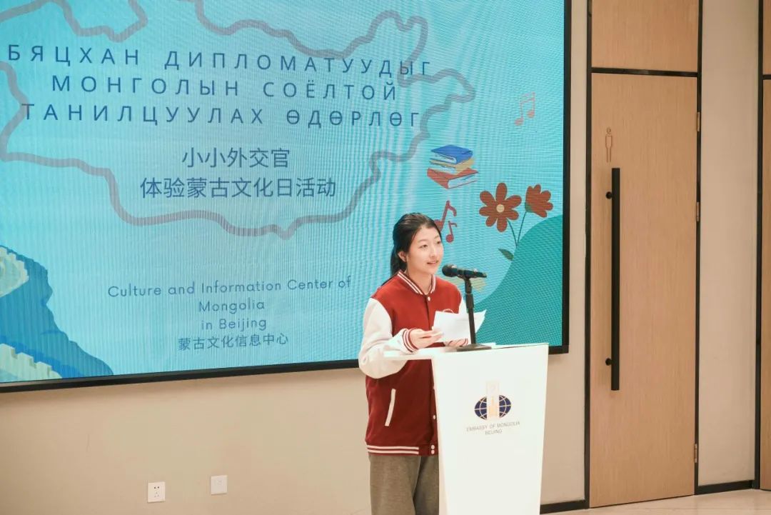 抵达蒙古国驻华大使馆后,同学们受到了大使夫人Tsetsegsuren(策策格苏伦)女士的热情欢迎。大使夫人身着美丽的蒙古服饰,用蒙古语和同学们打招呼,在表达了希望中国青少年增进对蒙古国的了解同时,还亲切地寄语同学们要把此次的美好体验分享给自己的家人和朋友。