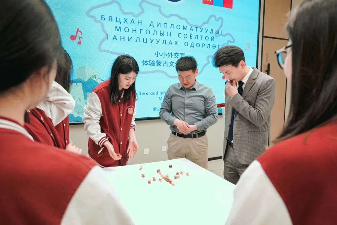 同学们在使馆参观中,不仅体味到了蒙古国的特色美食、习俗文化,学习外交知识,体验异国风情,还与大使夫人一同亲切聊天、玩蒙古游戏,与外交使节近距离对话互动,感受外交官的风采。