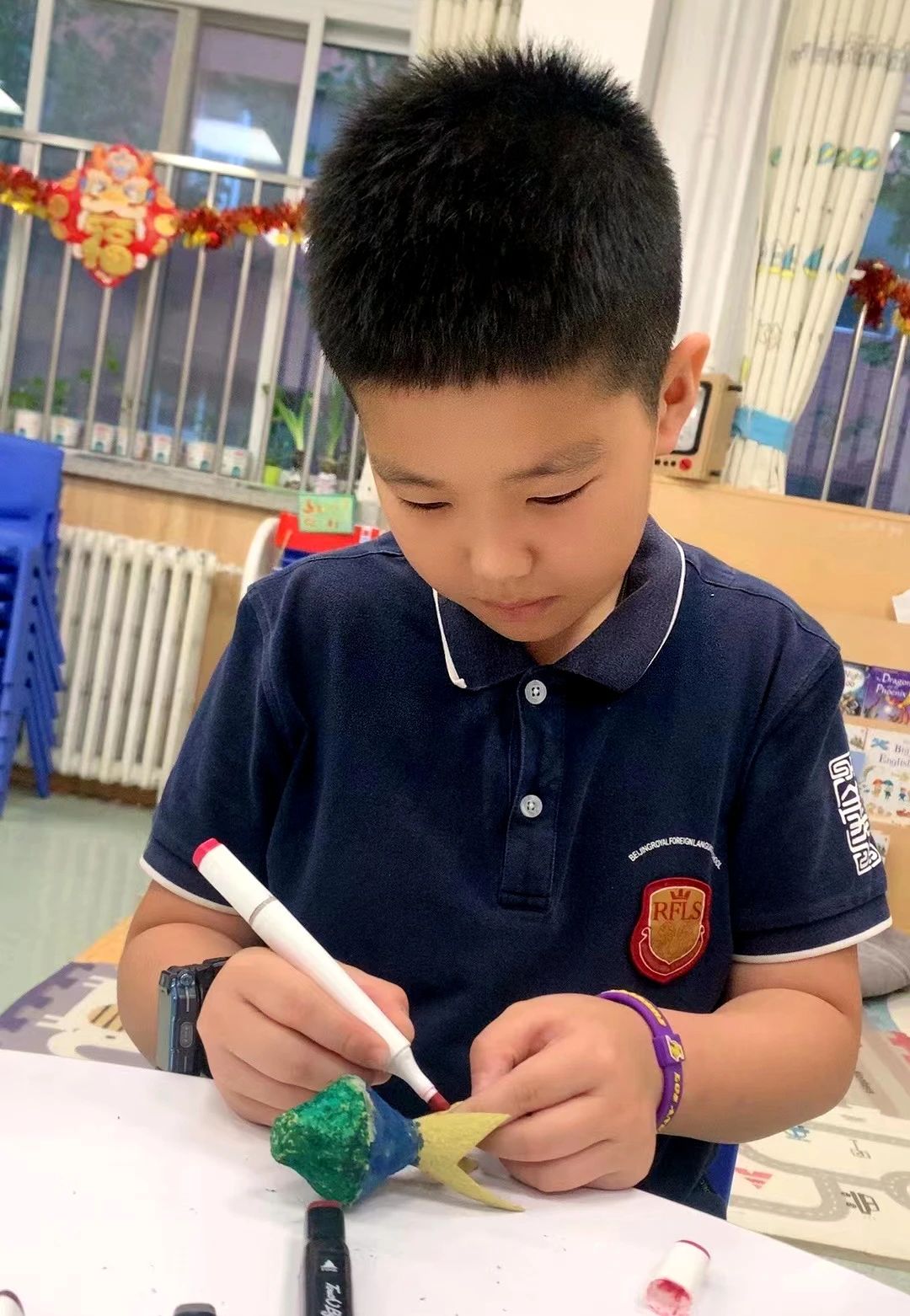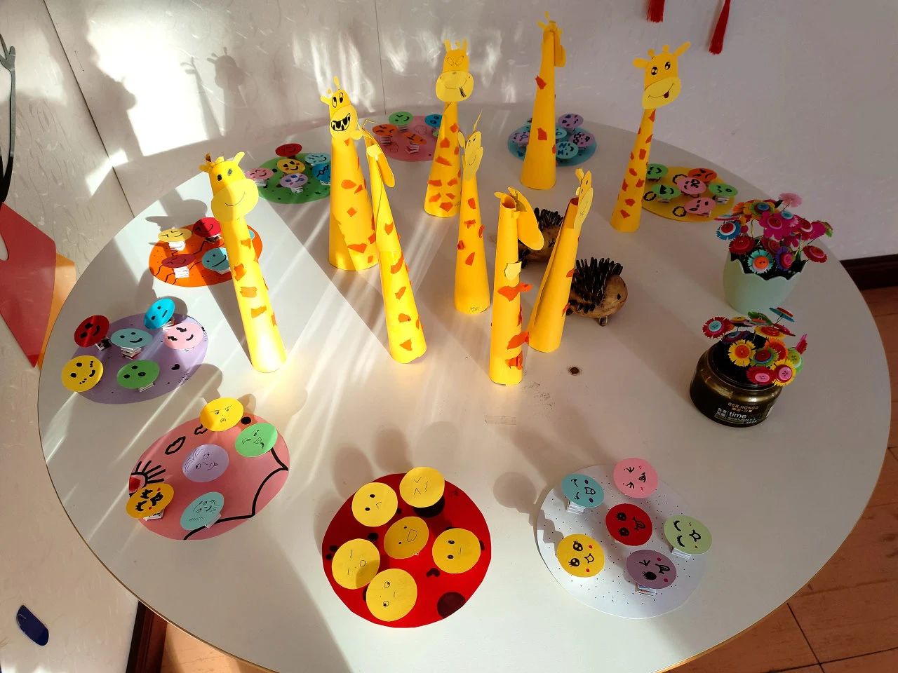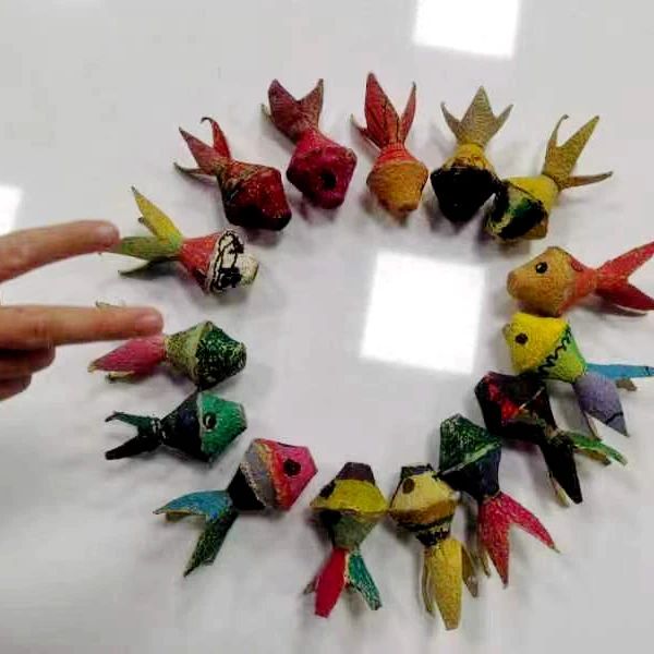 洁白的纸巾也不甘落后,幻化成了一朵朵晕染的花朵;导育老师们教孩子们用颜料、彩笔,将废弃的蛋托变身为灵动的昆虫,看着一只只飞舞的蜜蜂,一只只神气的瓢虫,一串串美丽的鲤鱼串,仿佛置身于童话的世界里了……