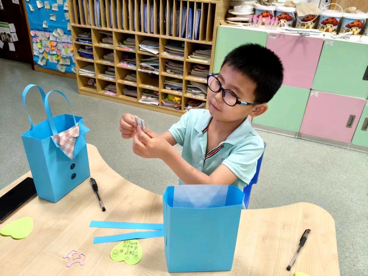 白白的卡纸也有了生机,经过几个回合的裁剪,绘画,一跃成为了充满生命力的弹跳球!再一折叠,哇!又变成了空中旋转的飞镖!为了迎接父亲节,卡纸又来了个大变身,化身成了一个个精美的西装礼物袋,孩子们把想对爸爸说的话都写在袋子上,里面盛满了娃娃们满满当当的爱!
