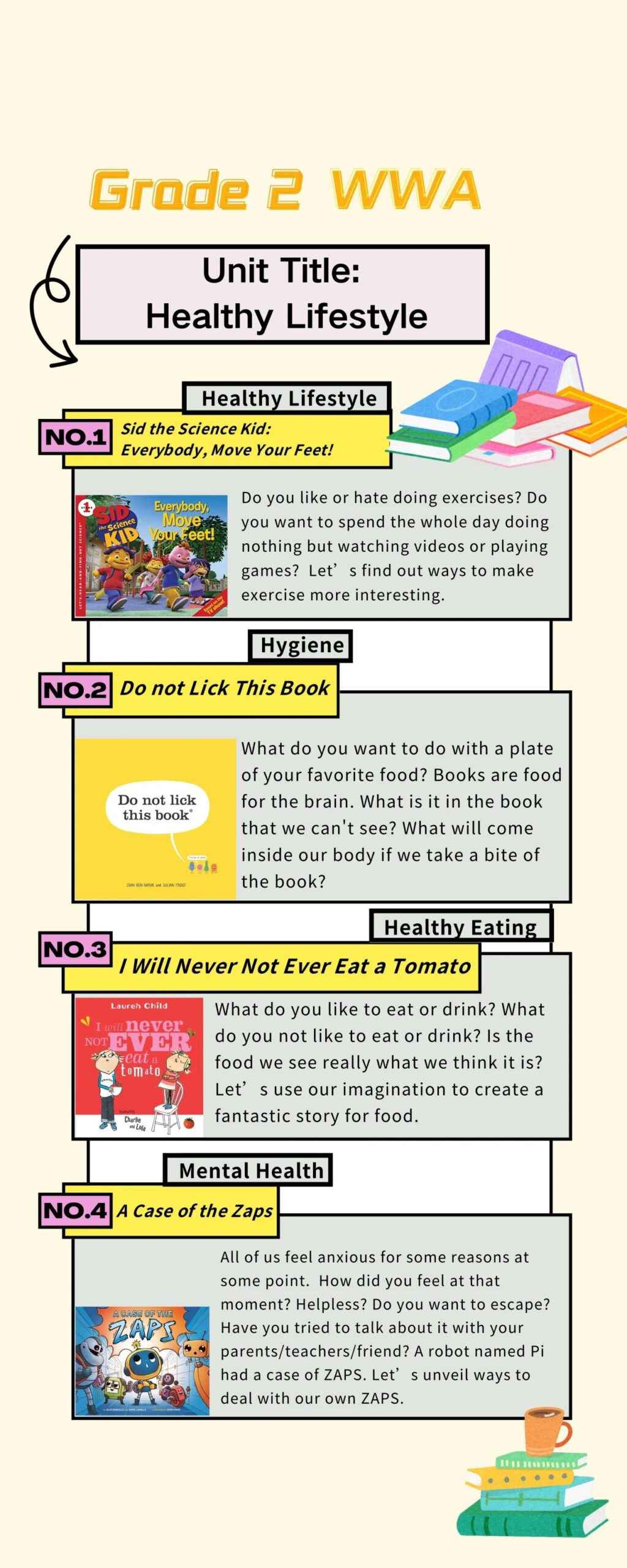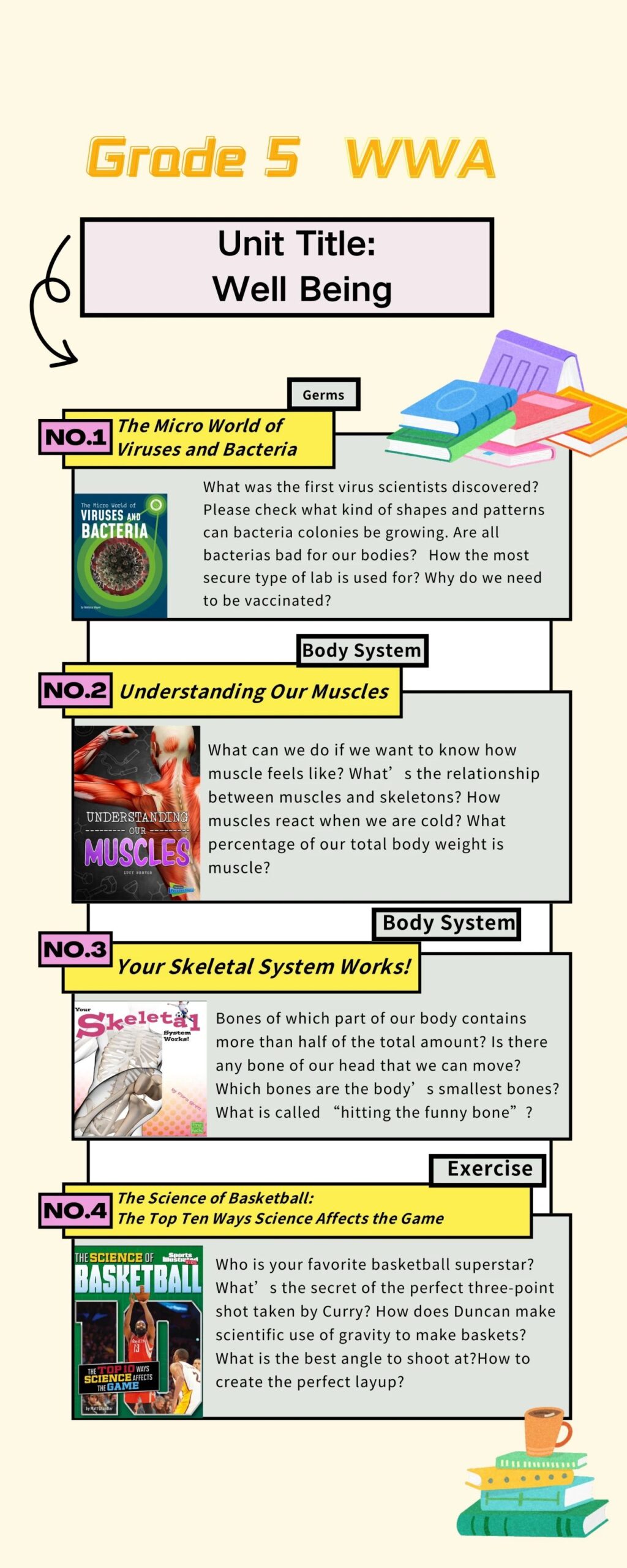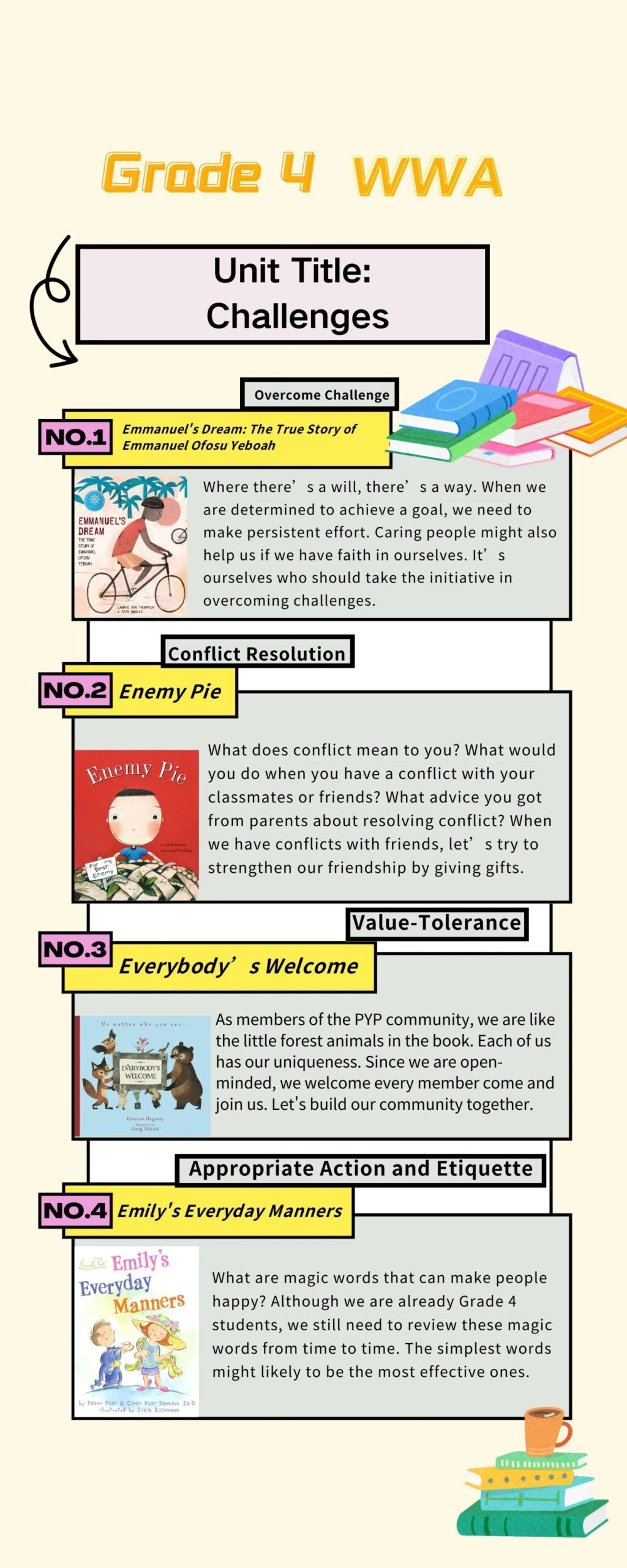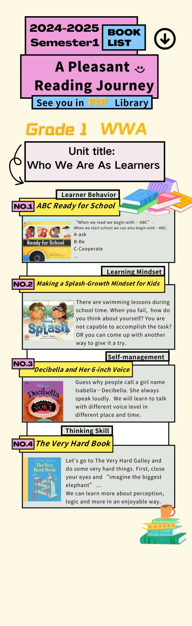 本学期PYP一至五年级第一个探究单元——“我们是谁”(Who We Are)课程已开始,下面是根据各年级探究单元名称设计的书单。请把这份书单作为本学期阅读旅程的起点。