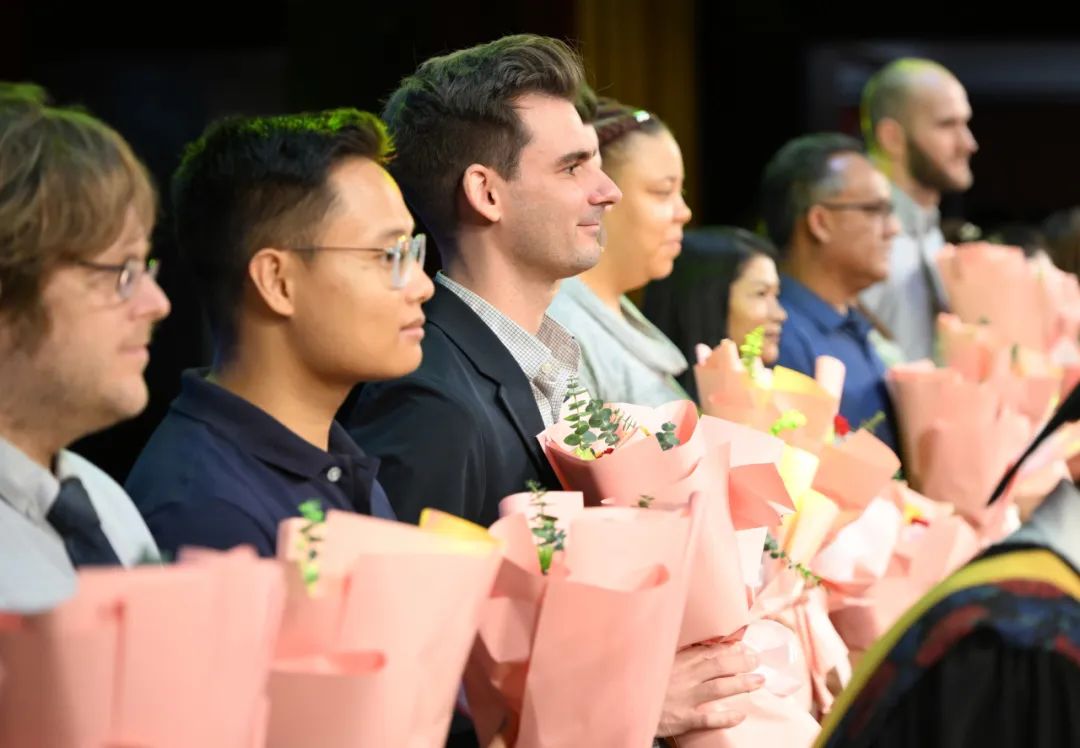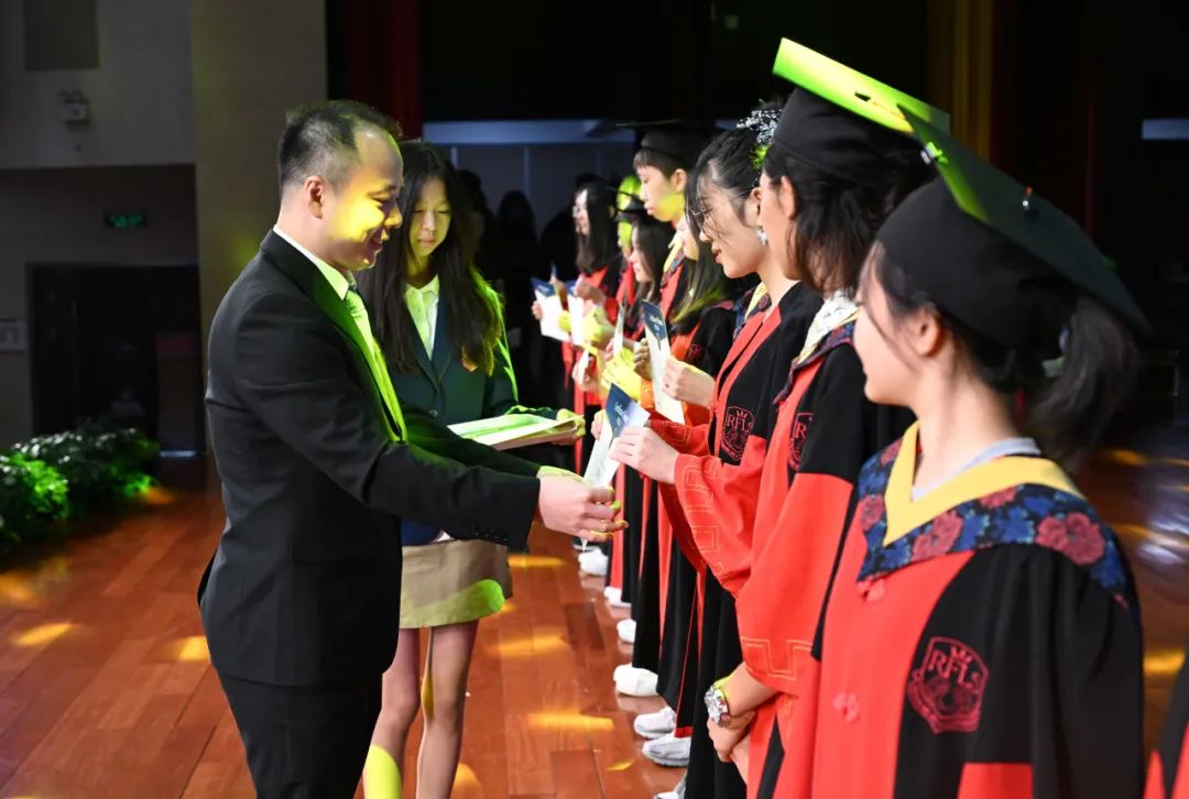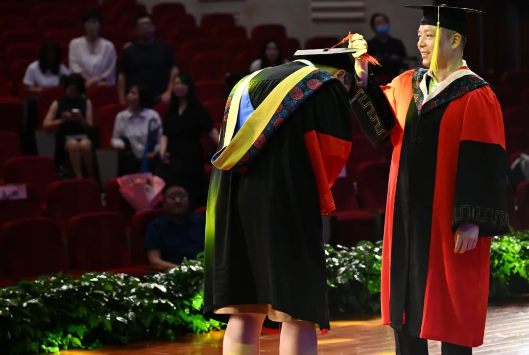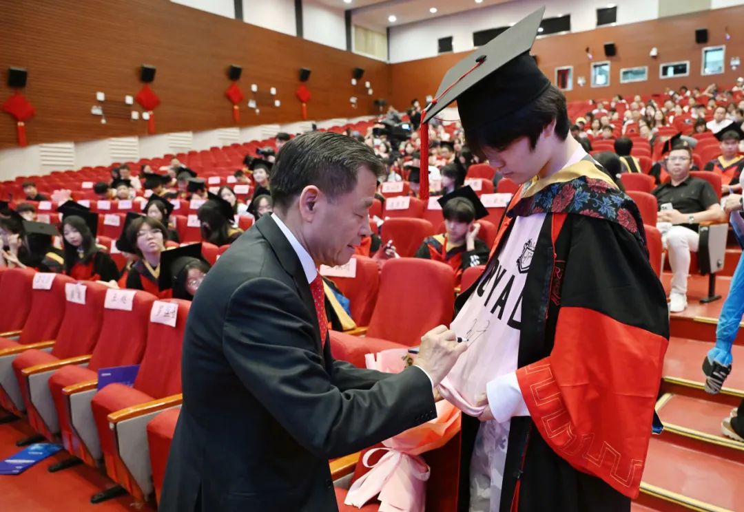随着老师们缓缓上台,台下不时地会传来学生们的欢呼,亦师亦友的气氛在毕业这一刻格外浓烈。毕业生代表为三年来辛勤教育的老师们送上鲜花,彼此拥抱,感谢老师多年的辛勤付出和谆谆教导。