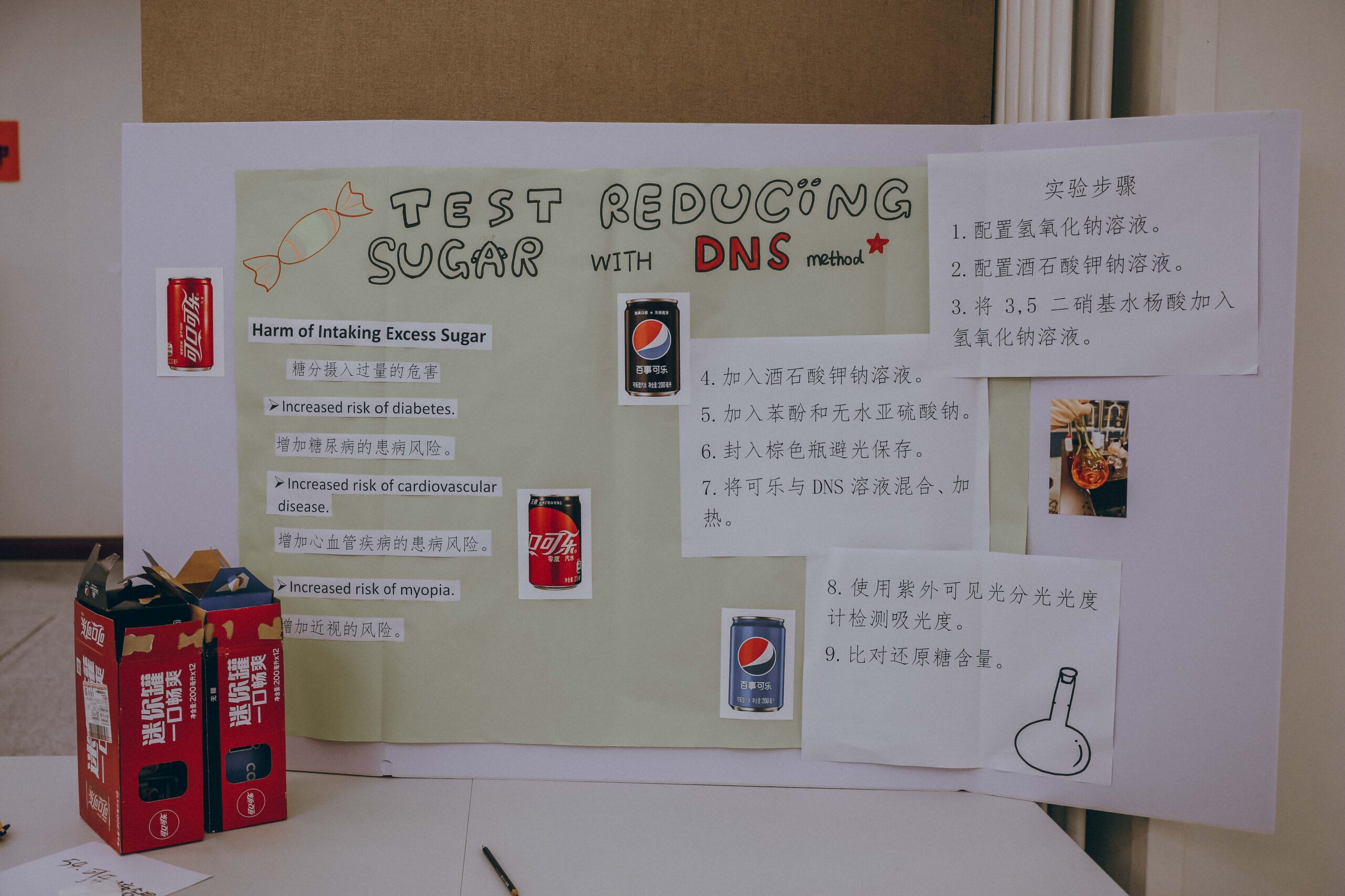 ▲学生将针对可乐饮料的研究展示在校园科学节中