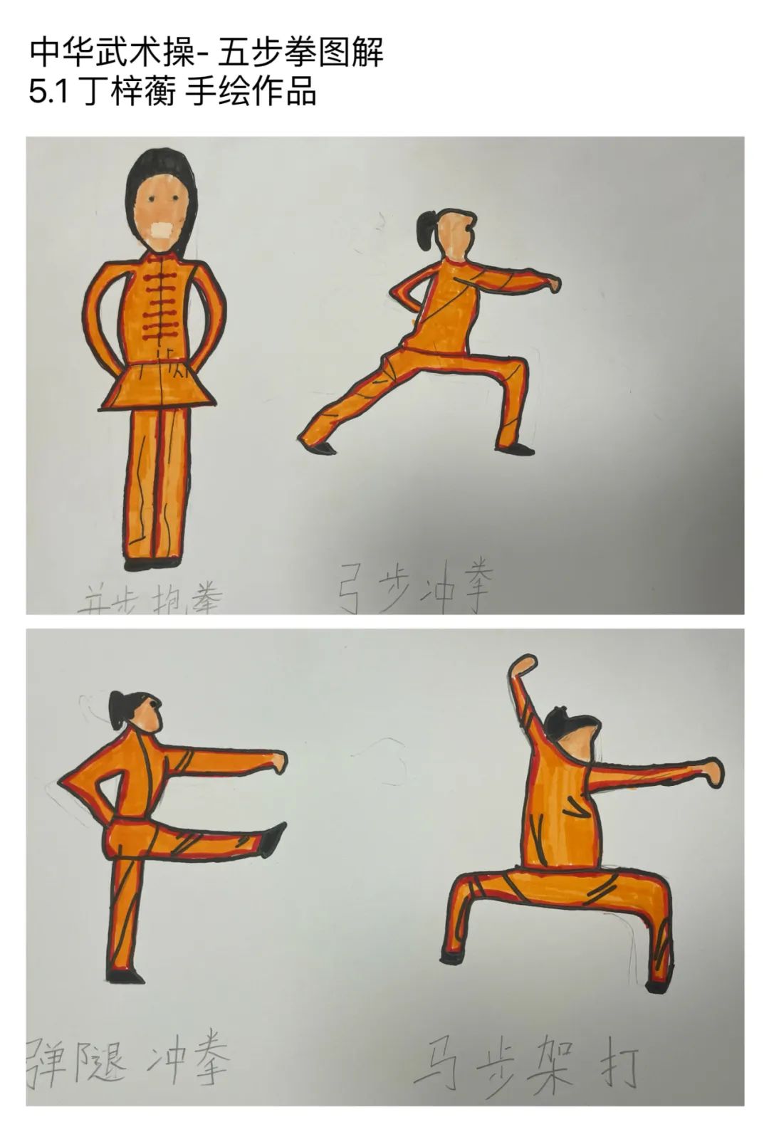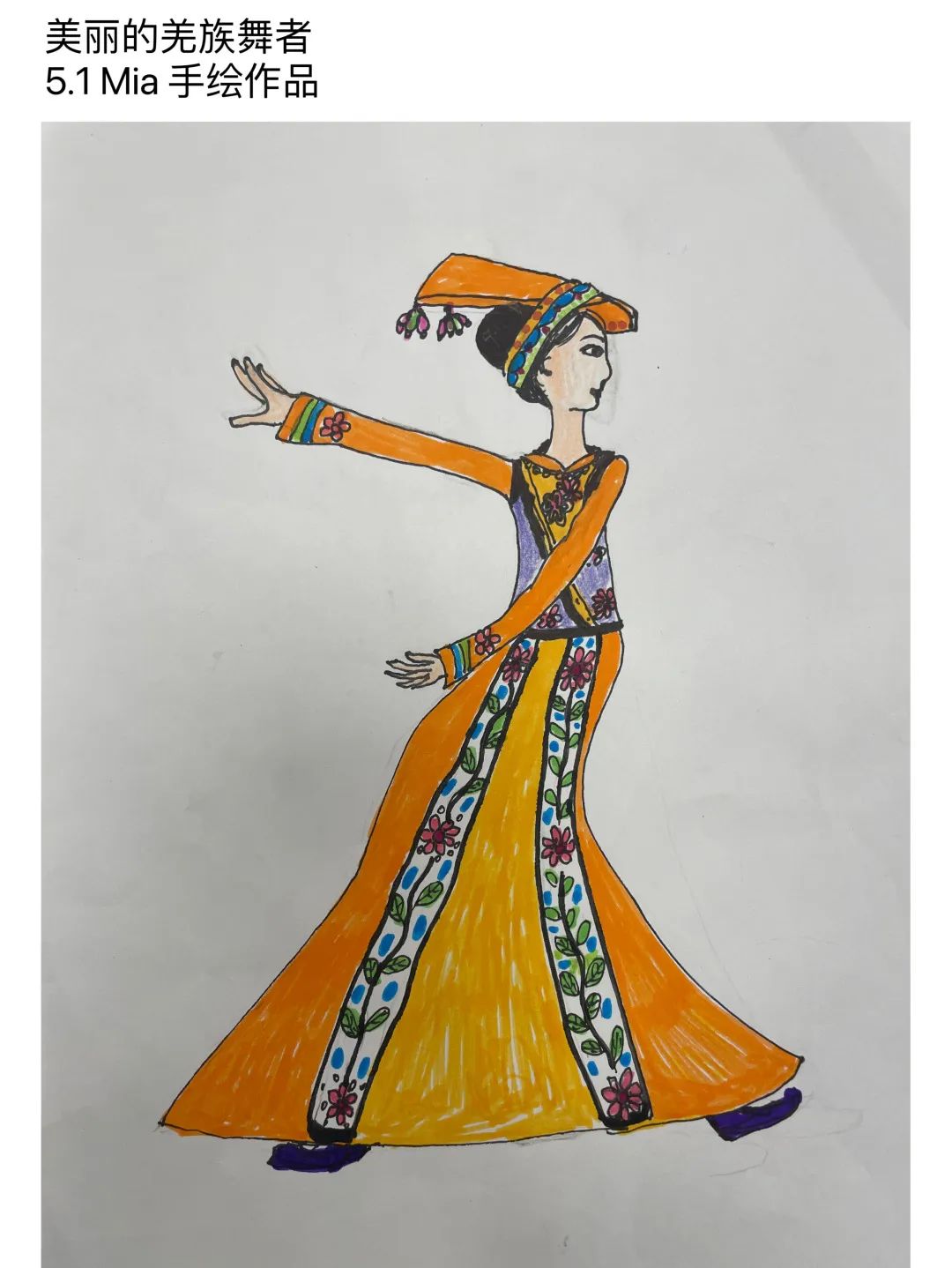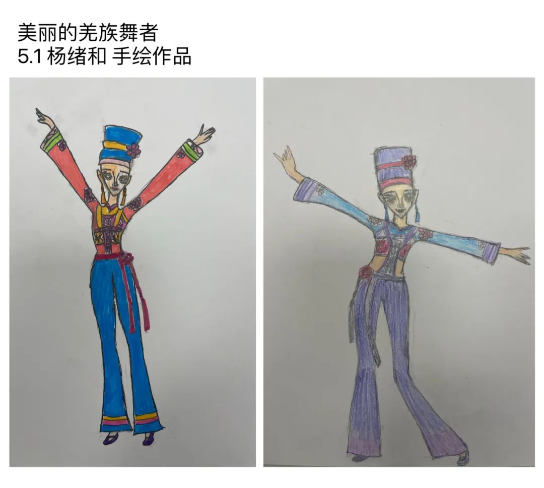 美术课堂上,体育老师带领学生重温学习过的武术操动作,强调动作细节。美术罗老师及时引导学生,注意在绘画时捕捉手臂肌肉的张力和身姿体态的控制,这种动作的描绘使他们更直观地体会到自律、专注带来的内在力量。同时,根据学生们喜欢动漫游戏的兴趣特点,鼓励学生结合喜欢的动漫游戏人物,将武术操动作进行大胆创意改编描绘。同样的,在描绘羌族舞蹈时,舞蹈老师再次示范了舞蹈动作,讲解动作要领,并带领学生体会羌族舞者通过动作传递出的质朴的幸福感——无论生存环境和物质条件如何,都要大方自信的舞动肢体,快乐地跳起来。美术老师则引导学生关注肢体的优美姿态和灵动感,观察羌族舞蹈服饰的美,让画作充满节奏与情绪。这种多角度的艺术体验,让学生对人体形态有了更深入的理解,也帮助他们体会到身体健康、心理健康与个体情感之间的联系。