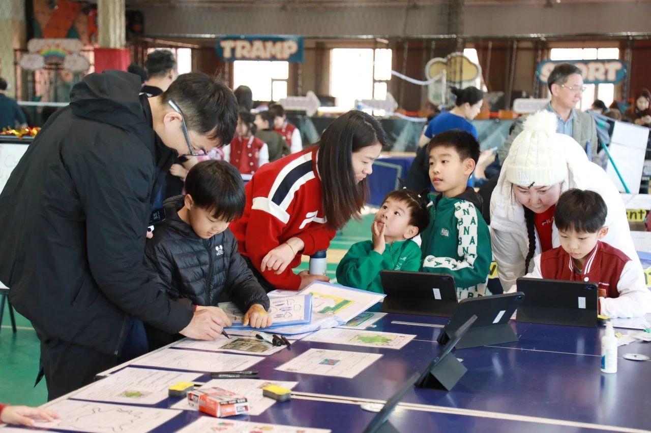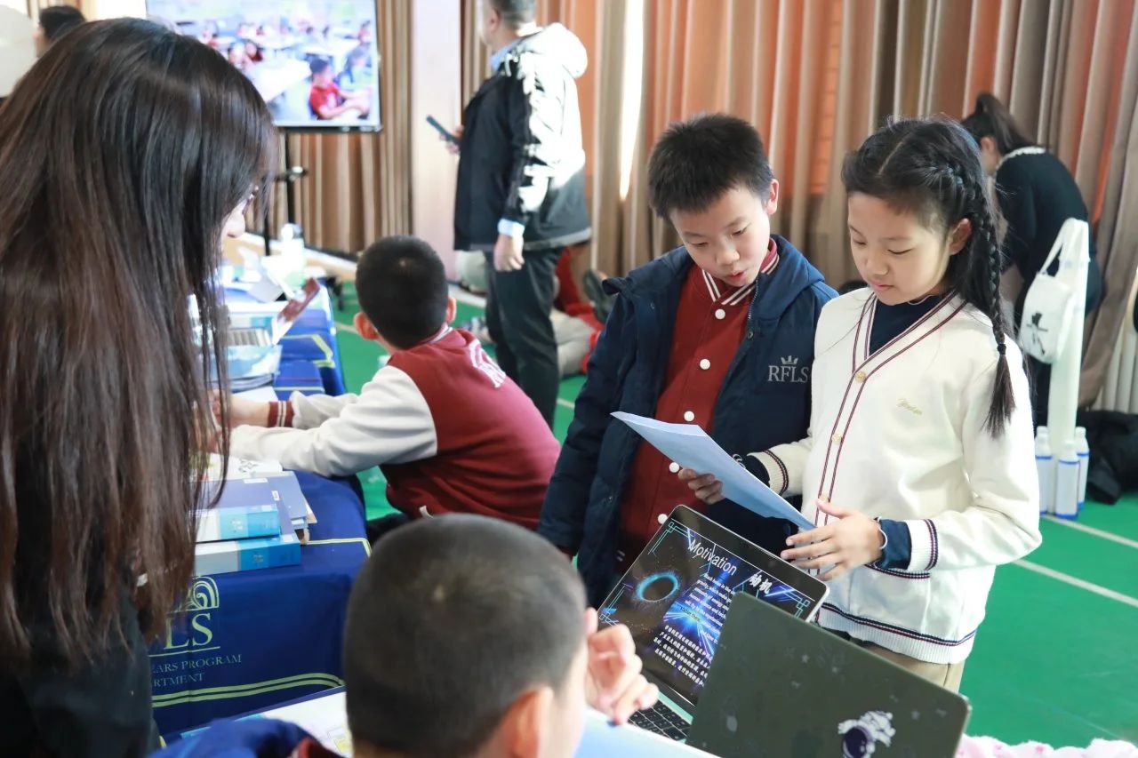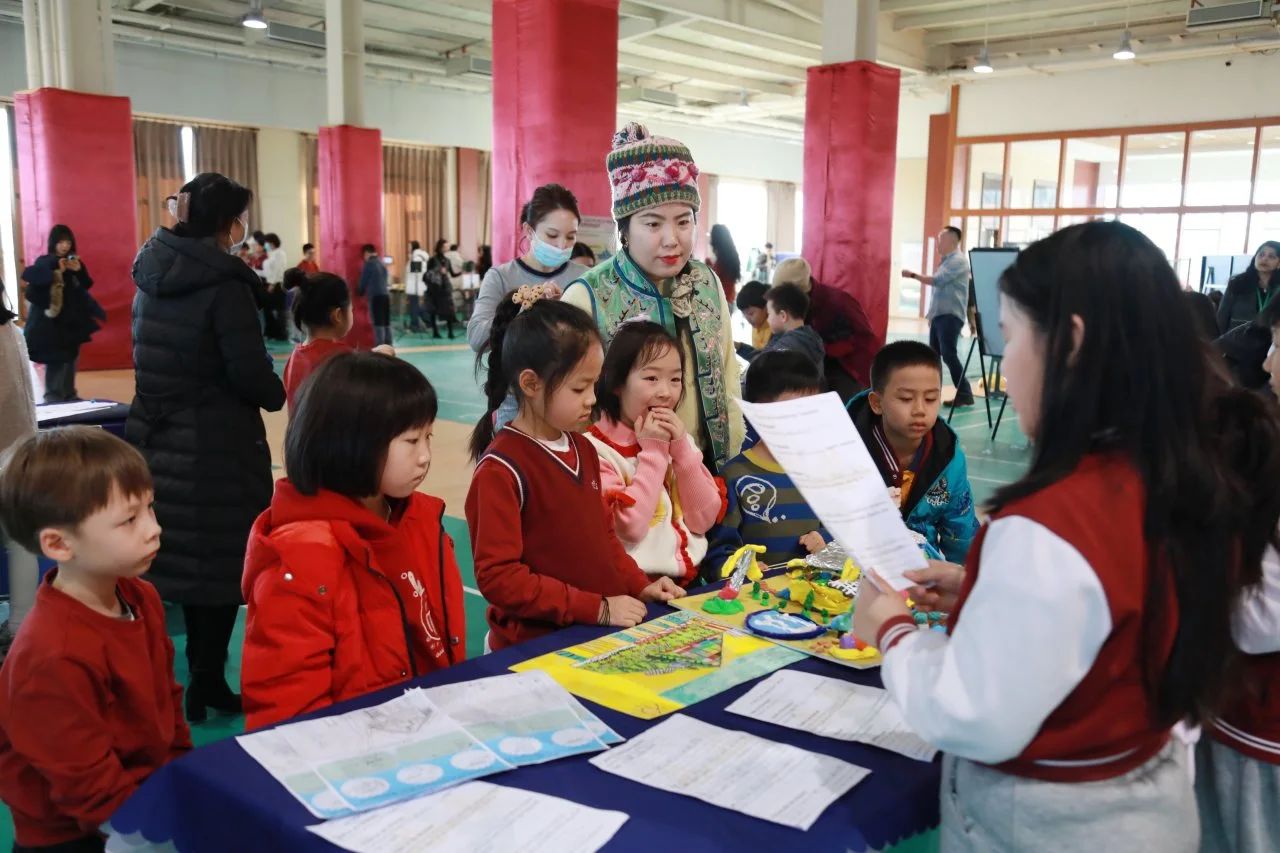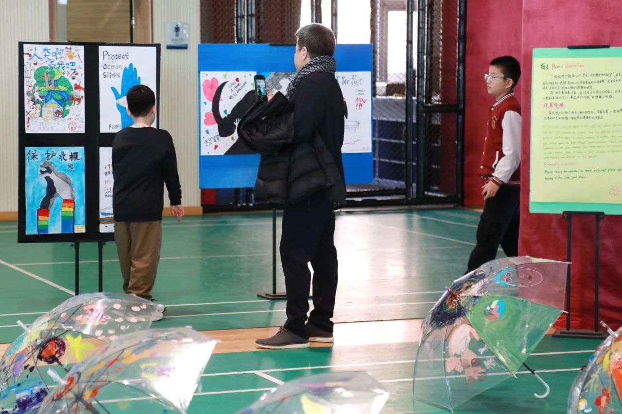 会议现场气氛热烈,观众们在各年级展台前驻足,认真听取学生小组的介绍分享。