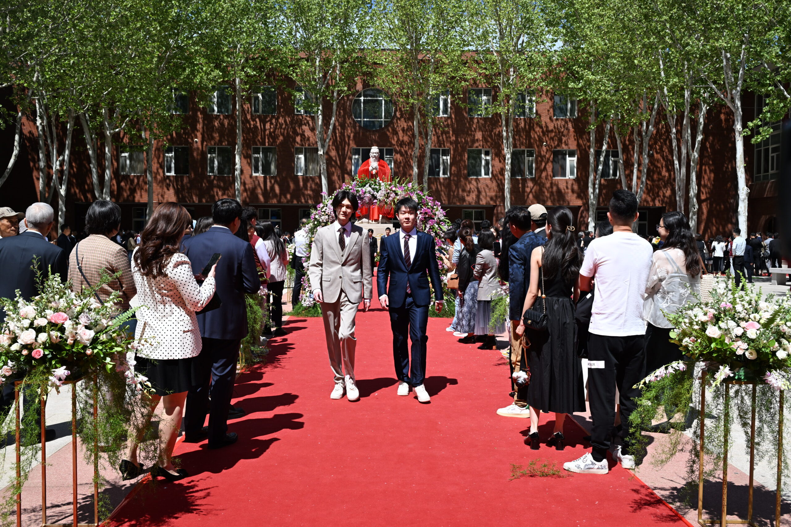 暮春的阳光斜斜地铺在红毯上,将少年们的影子拉得很长。2025届王府学子身着礼服,在一众期许的目光中一一走过缀满鲜花的“成人门”,一年一度的成人礼缓缓拉开序幕。