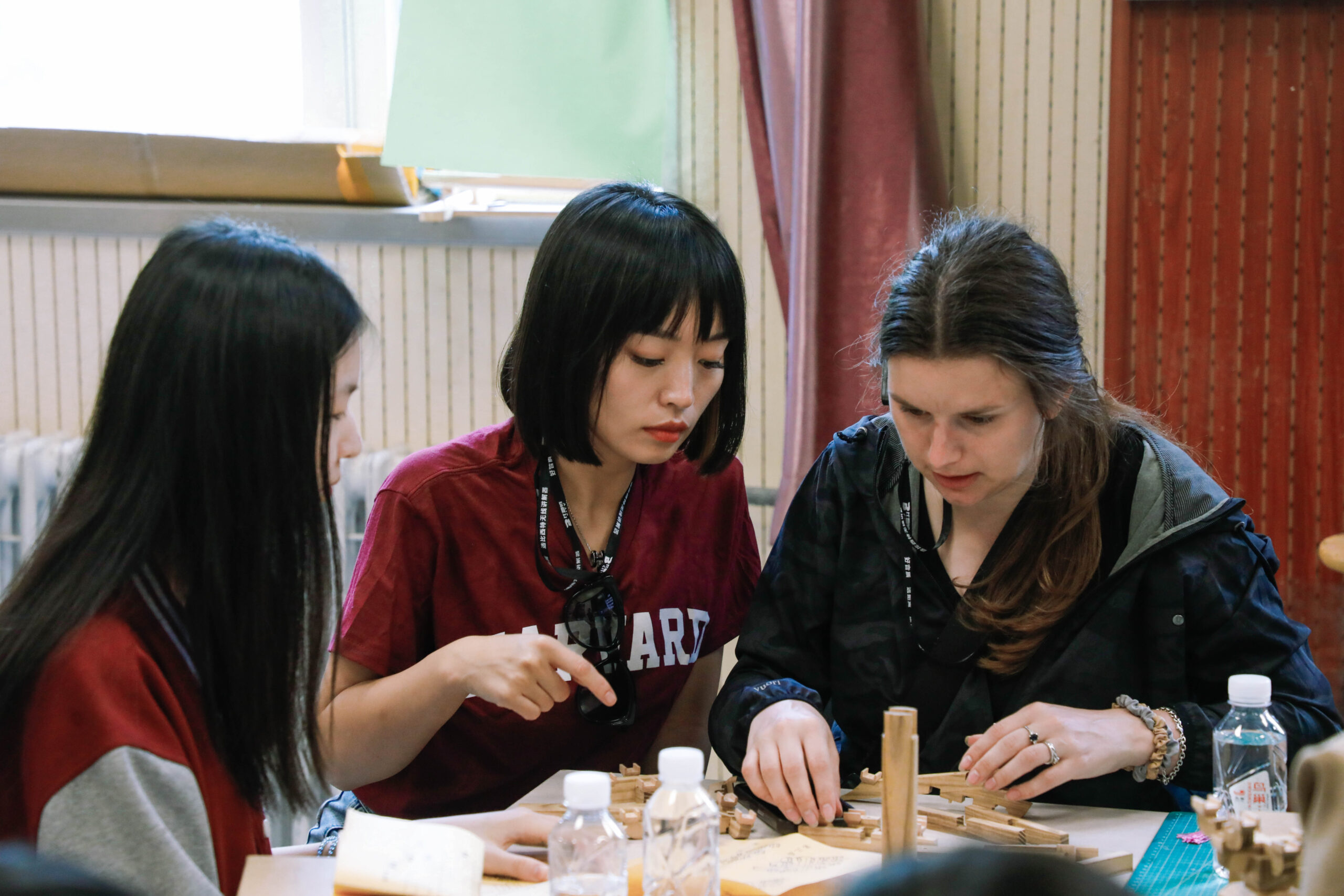 随后,代表团们来到初中部ROYAL营造学社,与初中生们一同探索榫卯结构的奥秘。一块块看似普通的木材,在无需钉子的情况下,通过巧妙的拼接形成稳固的结构,这份古人的建筑智慧吸引嘉宾们纷纷动手尝试,感受中国传统木工技艺的精妙之处。中外学子们一边制作榫卯模型,一边交流着各自对于传统文化的理解,现场气氛热烈而融洽。