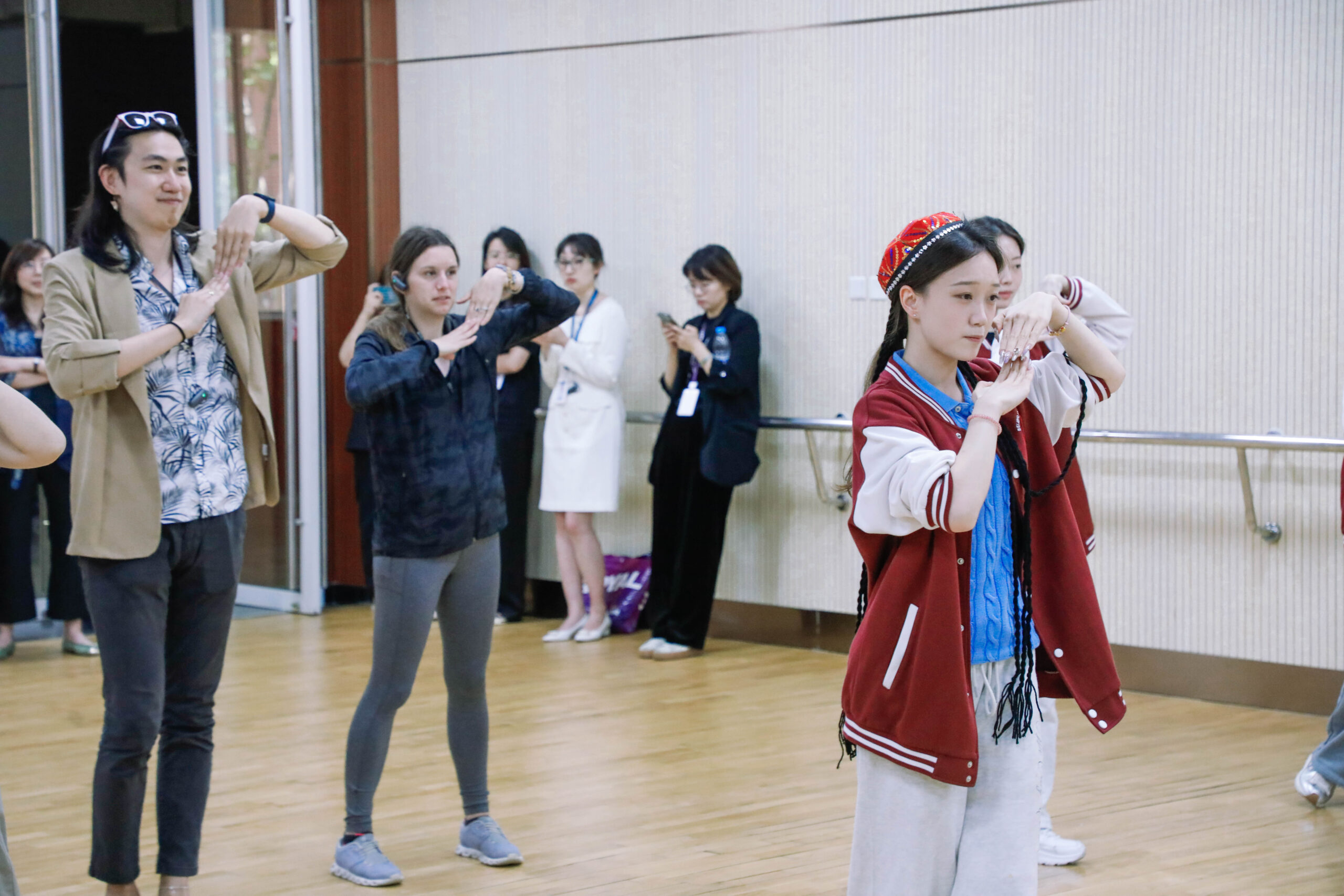 来到舞蹈教室,高三毕业班的学生们正在为即将到来的毕业晚会排练新疆舞。在充满地方特色与民族风情的律动中,代表团们也随之加入到舞蹈的行列中来,跟随节奏学习基础舞步,更对我国丰富多元的民族文化产生了浓厚的兴趣。