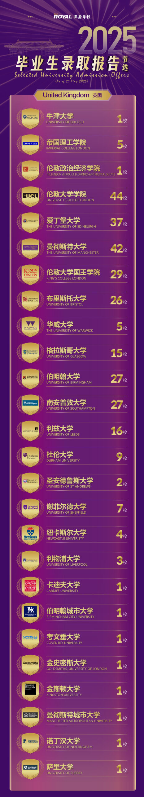 斩获牛津大学数学专业的无条件录取1枚、世界Top 2帝国理工学院5枚、伦敦政治经济学院1枚,G5名校录取量激增200%,超50枚G5 offer书写英伦荣耀。
