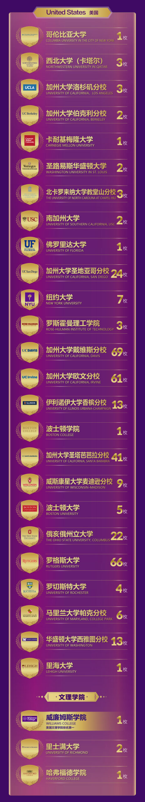 收获文理学院天花板威廉姆斯学院1枚、藤校哥伦比亚大学1枚、卡耐基梅隆大学1枚,更有四组顶尖名校三响炮——西北大学(卡塔尔)、加州大学洛杉矶分校、罗斯霍曼理工学院和北卡罗来纳大学教堂山分校各3枚,以及加州大学伯克利分校2枚、圣路易斯华盛顿大学2枚等重量级录取,美国Top 50录取比例高达93%,刷新王府历史。