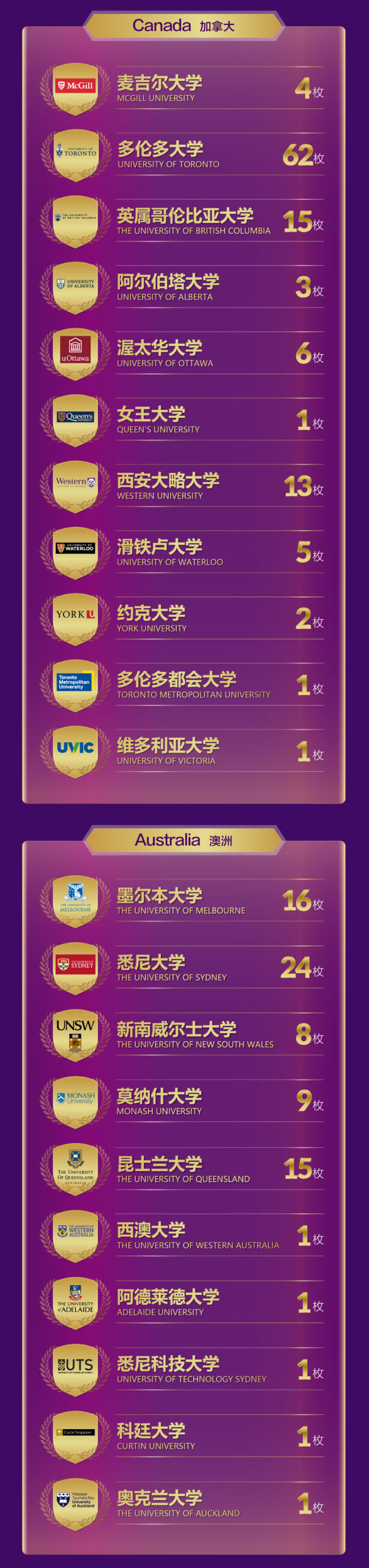 麦吉尔大学、英属哥伦比亚大学、墨尔本大学、新南威尔士大学以及新西兰“国宝级”大学奥克兰大学等纷纷抛来橄榄枝,墨尔本大学录取多达16枚,悉尼大学24枚,多伦多大学更是多达62枚。