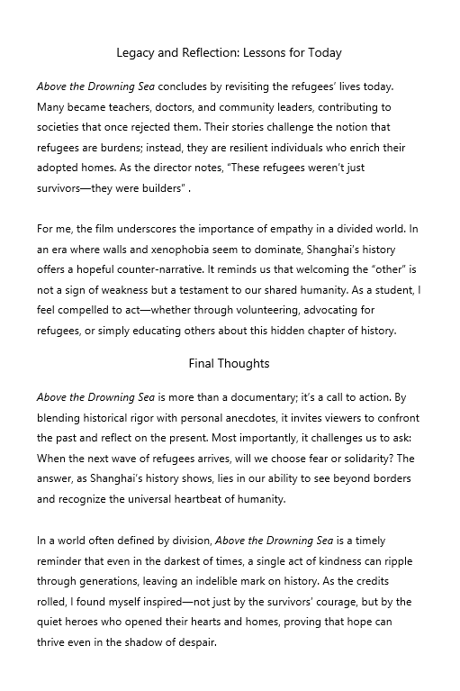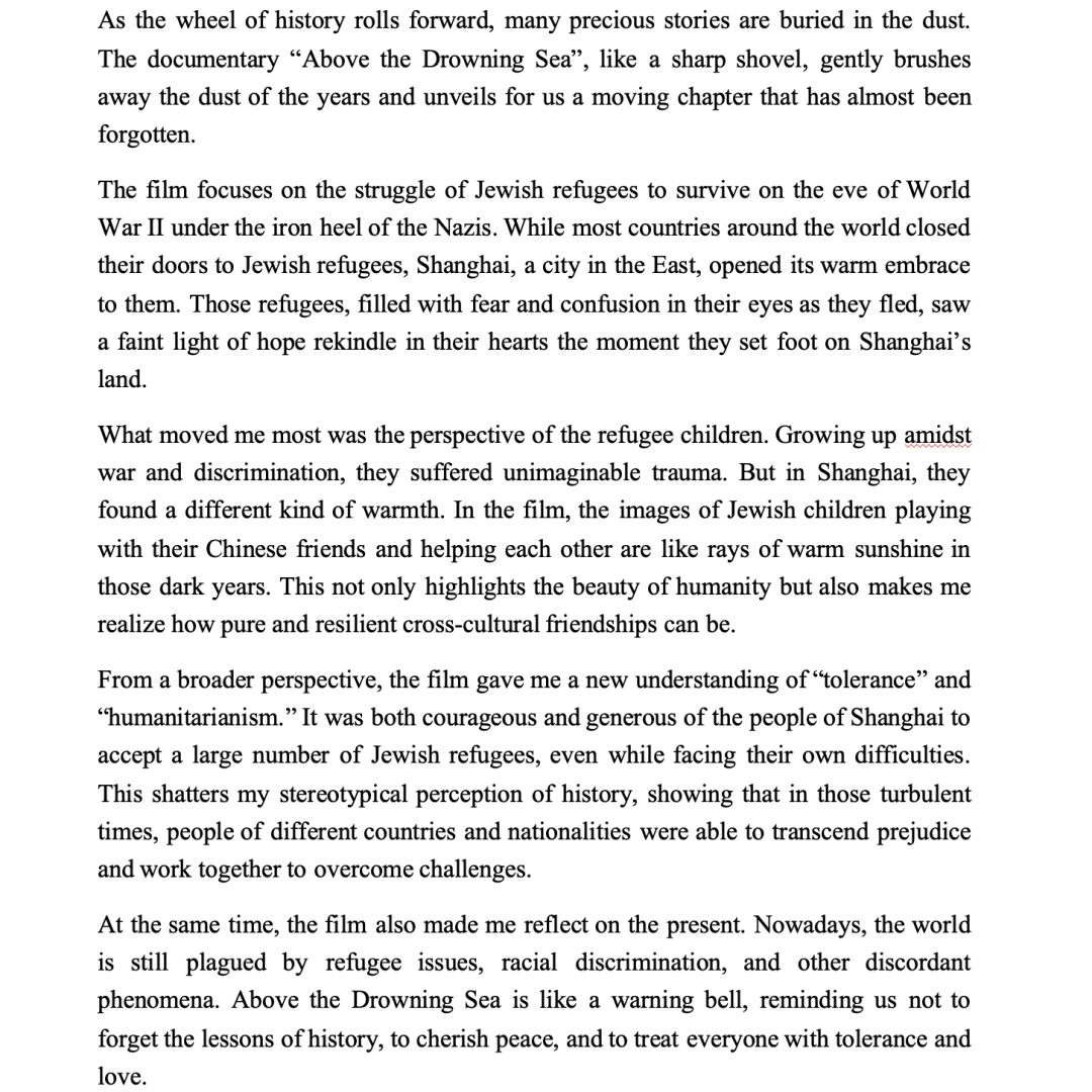 得益于北京国际电影节姜文主席的推荐,《上海馀生》让中犹携手守护人性的历史在银幕上重焕光芒。影片的播放在我校初高中学子中引发了强烈共鸣——有的同学将同理心内化为行动自觉,视影片为精神号召;有的同学对宽容与人道主义有了全新认知,反思当今世界的难民问题与种族歧视;更多同学将影片视为历史警钟,时刻提醒自己铭记教训,珍惜和平。初高中学子用全英文写下充满思辨的感悟,字里行间流淌着对历史的敬畏与对未来的担当,正是电影育人成效的生动写照。