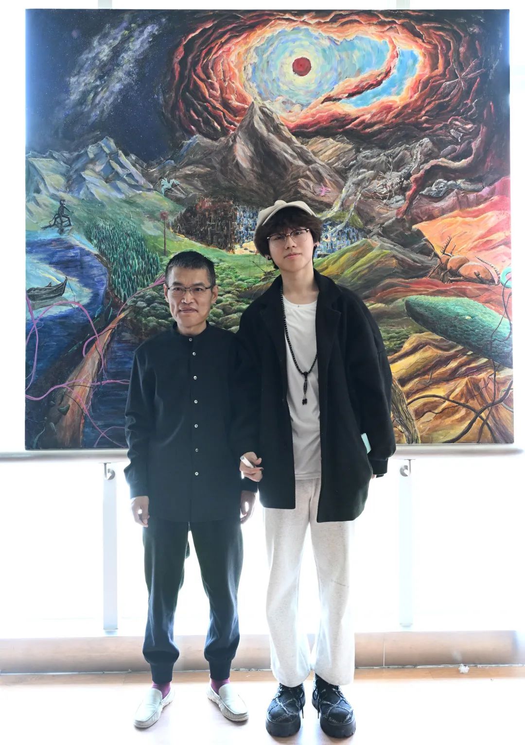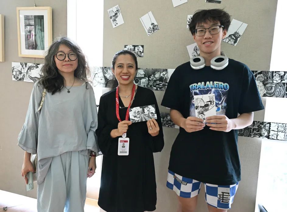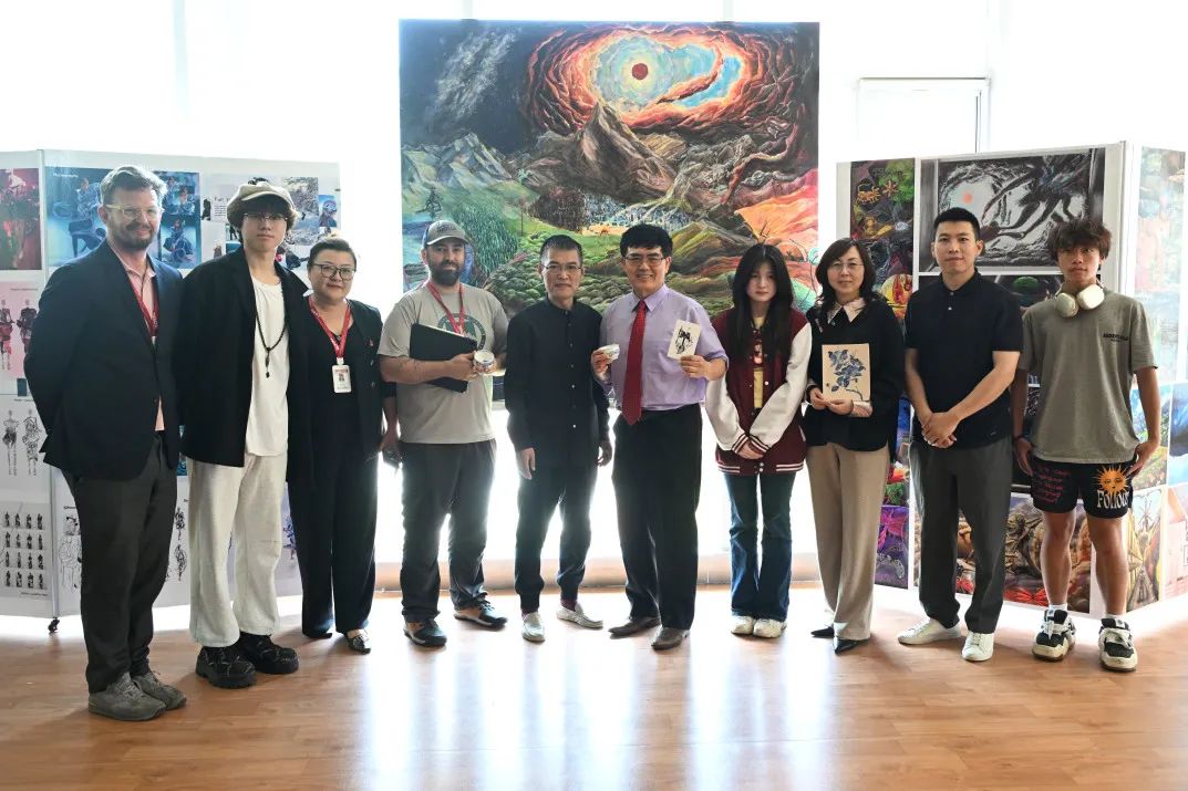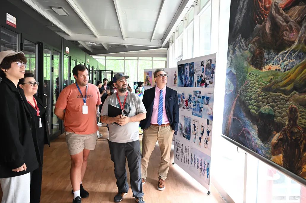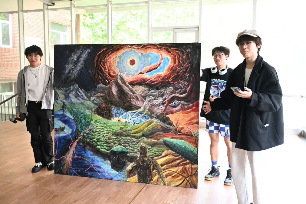 张仟粟同学(右一)在2025届毕业生艺术展上展示其画作《生灵战舞》