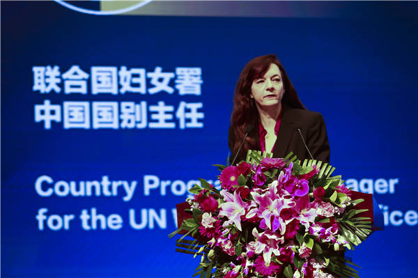 ▲联合国妇女署中国国别主任Julia Broussard(汤竹丽)致辞。