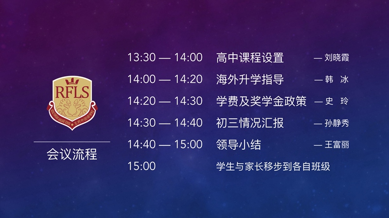 3月17号,北京王府外国语学校召开了本学期首次初三年级家长会,就初三毕业升学问题进行了指导说明,200多位家长齐聚在大礼堂参加了本次活动。高中部副校长刘晓霞(任期为2017/3/3至2019/11/11)、海外升学指导中心韩冰主任、招生办史玲、初三年级主任孙静秀和初中部校长王富丽等等多位领导纷纷上台,从高中学习生活、海外升学的详细流程与准备工作、本校直升高中的一系列优惠政策以及初三年级开学来的具体表现情况等几个方面进行了细致而生动的分享。