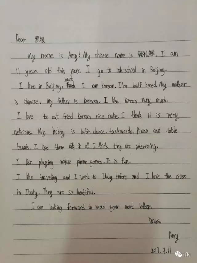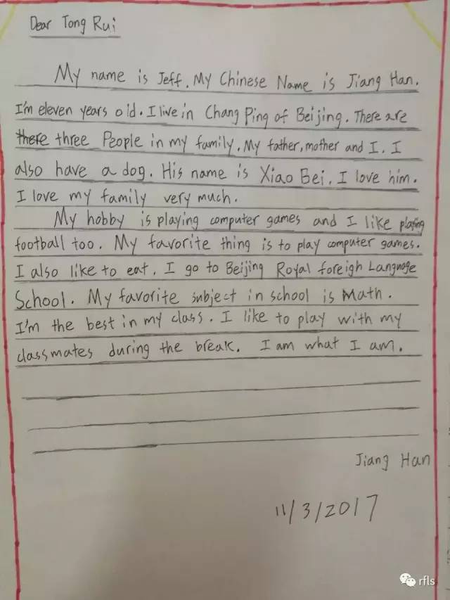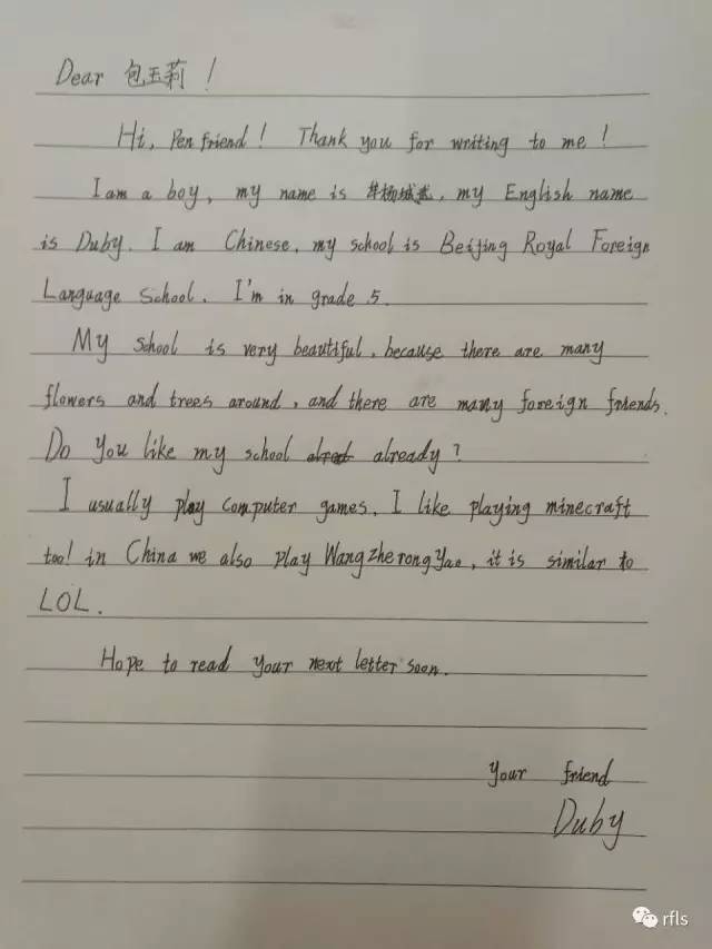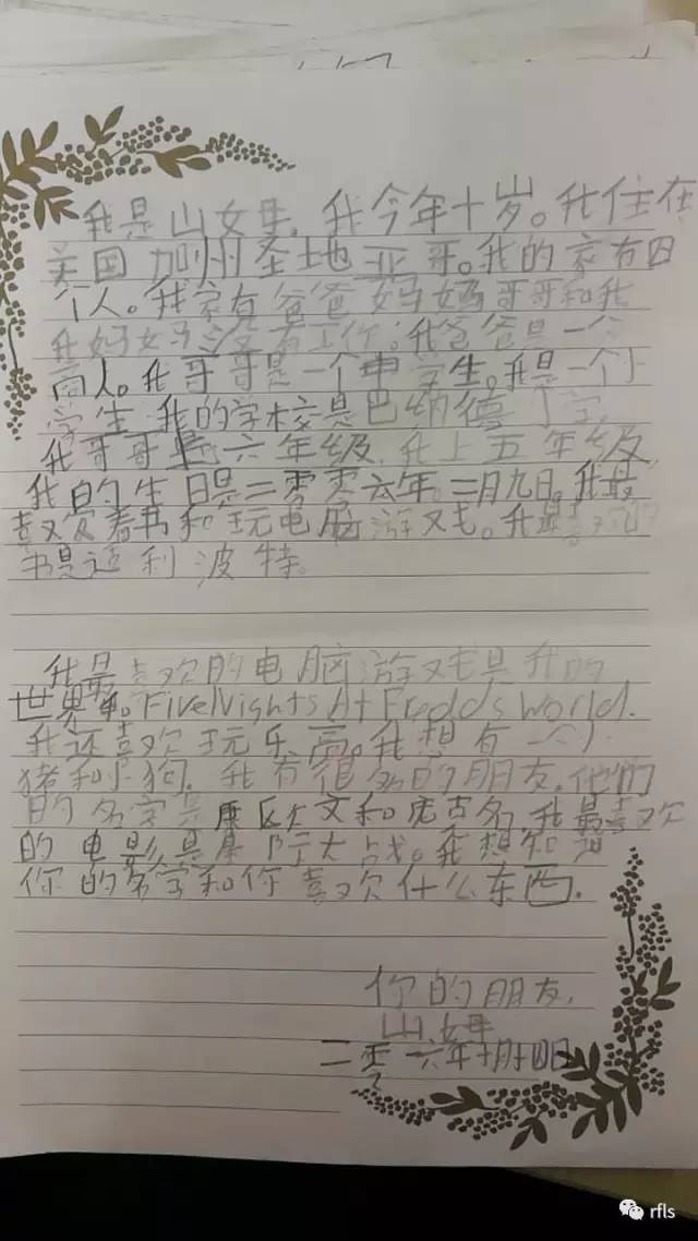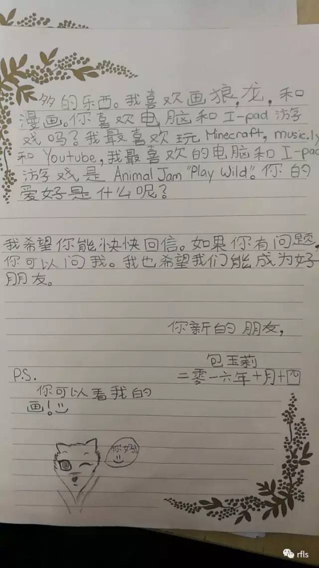 看着横平竖直的汉字书写,你似乎能看到信纸另一端的美国小朋友,正在严谨、认真地写着中华方块字。王府娃们在收到来信后,也为美国小朋友的中文水平惊叹不已。孩子们在书信中,互相做了自我介绍,把自己的家庭成员、爱好一一说明,并期待不久后能收到对方的回信。