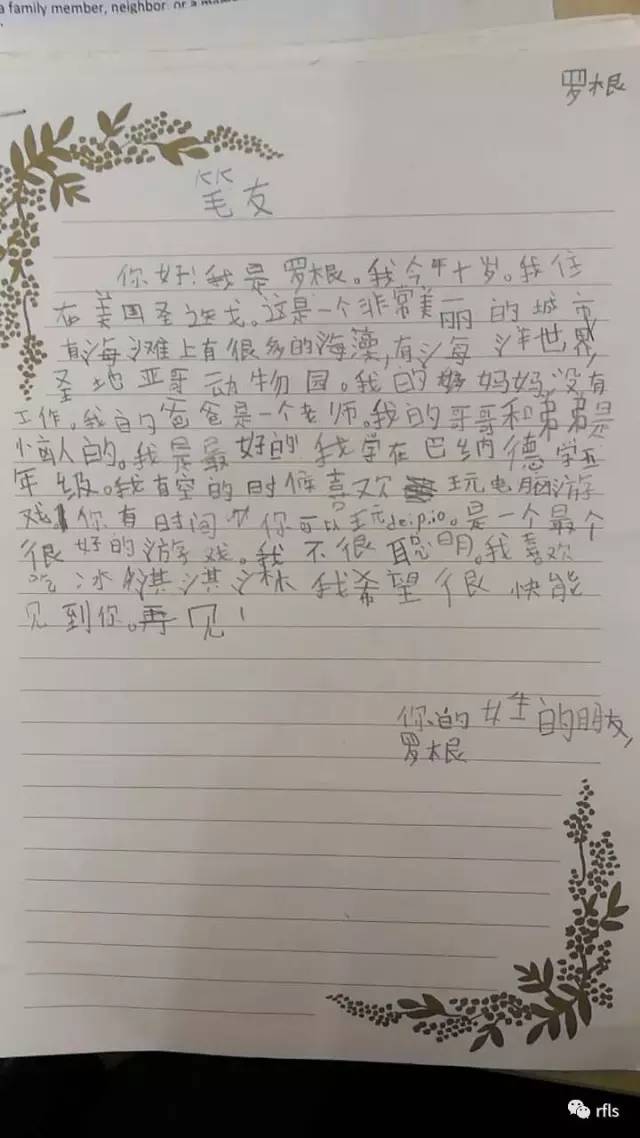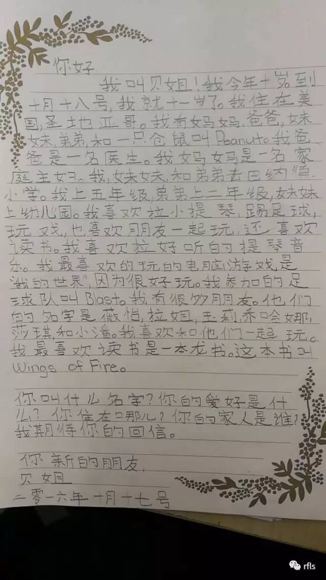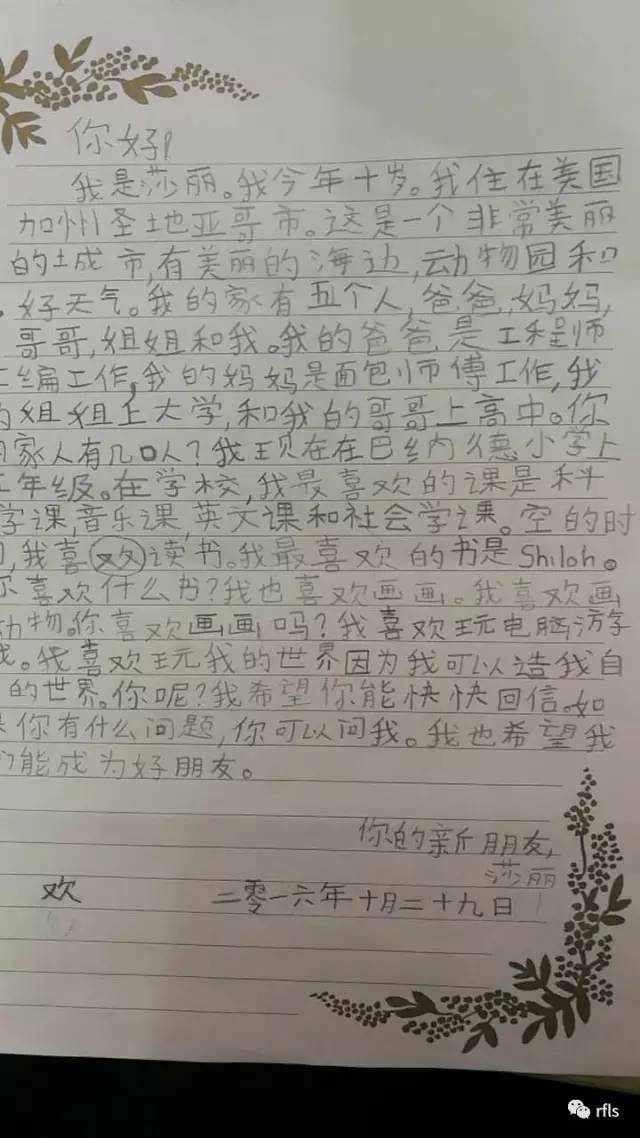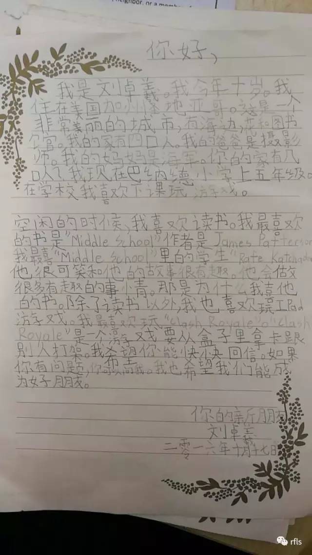 接下来,我们一起欣赏一下小学部学生和美国圣地亚哥巴纳德小学的学生之间的往来信件吧。