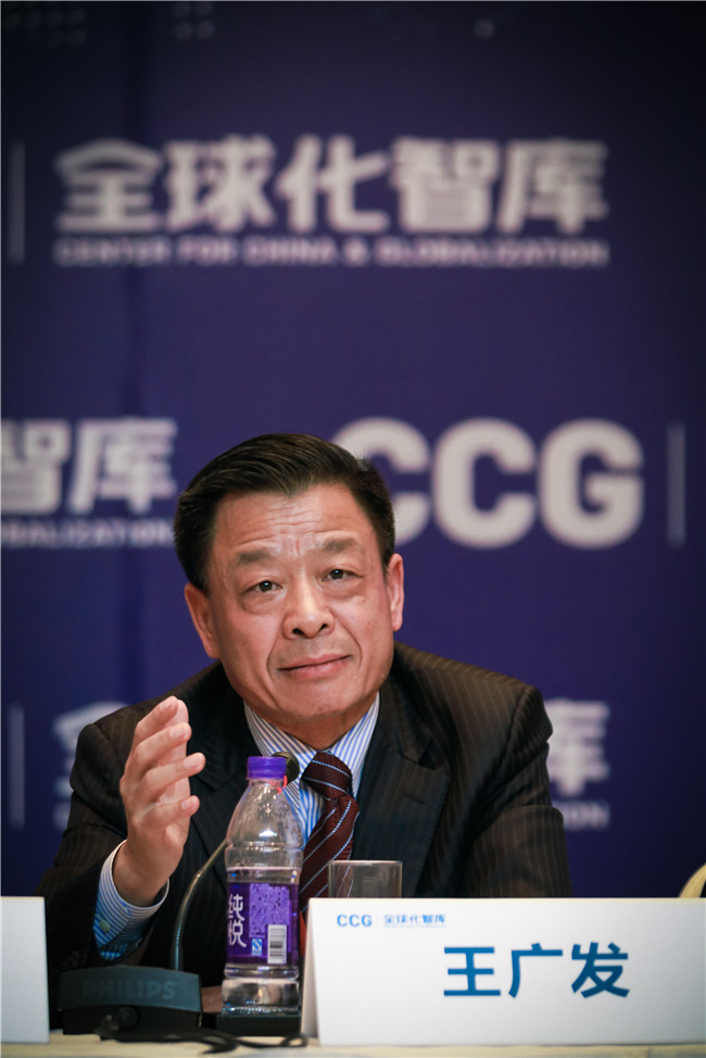 ▲法政集团董事长、北京王府学校校长王广发(前排中)在“第三届中国与全球化圆桌论坛”发言