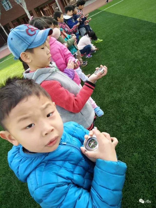 老师给孩子们介绍了不同形状和不同种类的指南针,通过观察、对比,孩子们发现,每一个指南针的指针,都有一个红色的区域;每一个指南针的表盘上都有东、南、西、北四个基本方位,有的甚至还有东南、东北、西南、西北更加详细的方位。通过对指南针的观察,孩子们不仅更加熟悉了方位,而且还学会了用英文表达方位,很好的做到了中西合璧。
