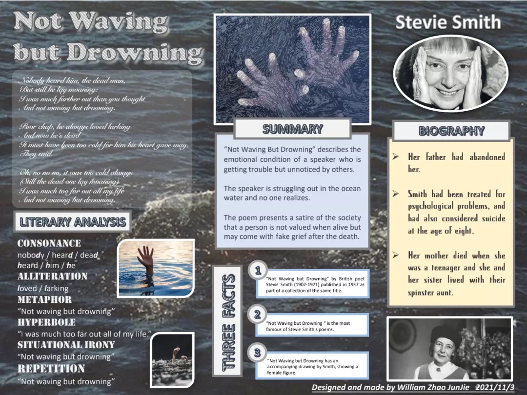 老师评语:赵俊杰同学设计的海报几乎可以算是教科书式的标准作答。从图片、背景、字体、排版等方面各个细节的选择,可以看出学生的用心。特别可圈可点的是对于Not Waving but Drowning整首诗的概括和修辞分析。短短三句话准确地总结了这首诗的立意以及它一并传达的社会意义。此外,对于诗中六种修辞手法,赵俊杰同学能够精准分辨并进行分析解释,说明他在制作海报时是有独立思考和思辨的过程的。他写的论文整体结构清晰,重点突出,visualize、satire、fake grief等用词水准高于平均水平。总体来讲,不管是海报还是论文,都是非常优秀值得借鉴的作品。