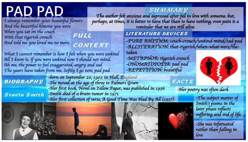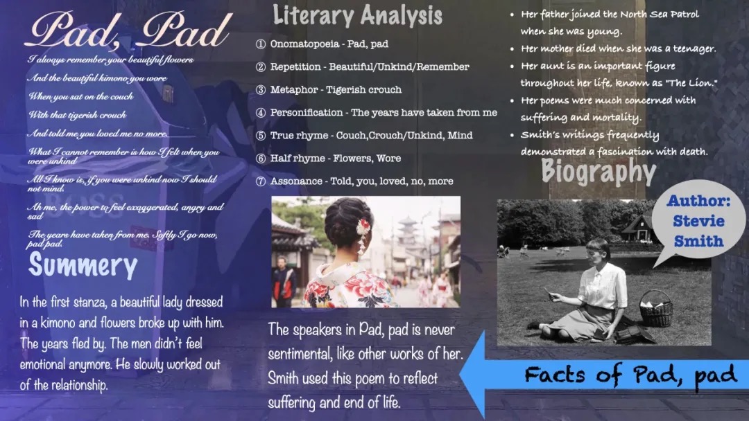 “ Pad, pad is a poetry about love and memory, which was written by Stevie Smith. According to the content, the readers can realise that this was not a pretty love thoroughly because the beautiful female told him that she loved him no more. So I used the deep blue background to express the depression of broken-hearted love. Blue is a typical cool color, which can make people feel cold. Also, I choosed the Snell Roundhand for the font of poetry. Cursive English looks classical and romantic, which can show the main tones of this poem. In the plate of Literary Analysis, I used modern font to improve the clarify. ” (作品介绍节选)