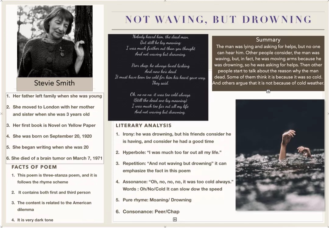 “ My poem is “Not waving, but drowning.” The author is Stevie Smith. The reason why I choose this photo of her is because I consider it is one of her most beautiful picture, and she was looking down for something, which can be correlated to the poem. The poem is about a man drowning in the river, and other people look at him. If people can image like this way, they may understand. I choose to use all picture in the dark colored, this is because I consider the whole poem is about irony. And the overall style is very classical, because I consider she spent much on London, this style can be corresponded to that city at that time. ” (作品介绍节选)
